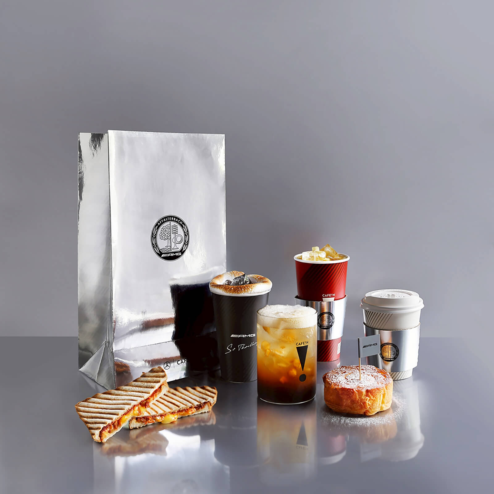 整體外包裝同步換上AMG經典色系—紅與黑,並融入象徵品牌經典Silver Arrow的銀色杯套與紙袋設計。值得收藏的三款人氣周邊:AMG地表最速聯名濾掛組,包裝設計結合AMG車款引擎動力,讓咖啡的風味層次與烘培程度,就像AMG 43、53、63不同動力的引擎,帶給味蕾從強勁到狂野的漸進式體驗;以及AMG隨行杯咖啡豆組、AMG保溫壺,杯身皆以俐落外型,隨行杯以俐落外型展現AMG設計語彙,搭配CAFE!N精品咖啡豆,感受AMG超越理性的激情。