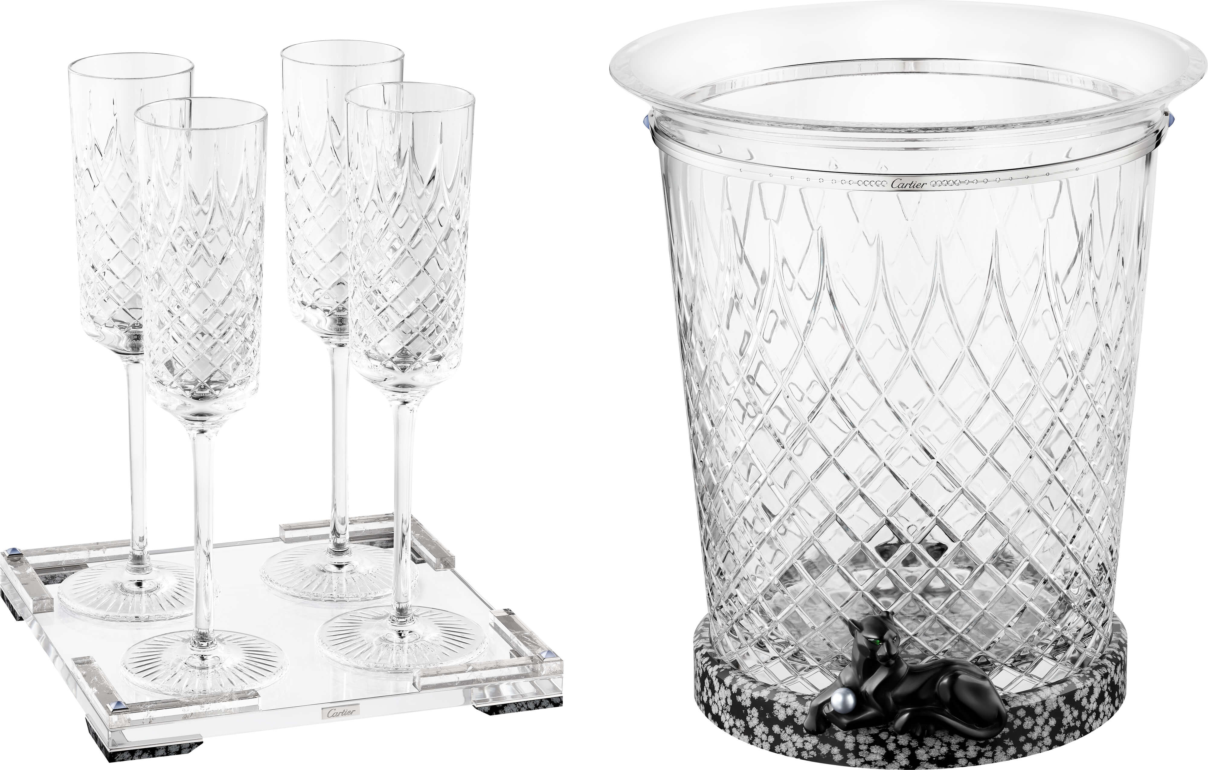 寶石雕刻是一門需要極度專注與精湛技藝的藝術。雕刻師的精髓在於駕馭材質,馴服其天性,展現其美感,同時精準配合珠寶設計師的構想。更重要的是,不得損傷寶石分毫,因為每一顆寶石都是獨一無二、無可取代的。稍有不慎,一個笨拙的動作、一次不精確的拿捏、一絲對紋理或內含物的誤判,都可能毀掉寶石的價值,以及耗費數週甚至數月的心血。卡地亞是全球唯一在品牌內部設立寶石雕刻工坊的珠寶商,並由經驗豐富、備受推崇的藝術大師親自指導。這是來自於尊貴的的聖路易水晶製造廠。對於這款非凡的套裝,卡地亞與法國和歐洲最古老(1586年)的著名水晶製造商聖路易合作。每個杯子都完全由聖路易的專家手工吹製而成。它們的柄經過精心手工拉伸,然後採用精湛的雕刻和拋光技術完成。這種纖薄而精緻的藝術品需要高水準的品質要求,並採取零缺陷政策。設計的技術性和卡地亞的品質水準非常高,以至於需要生產100杯子才能僅供應16支完美的杯子。