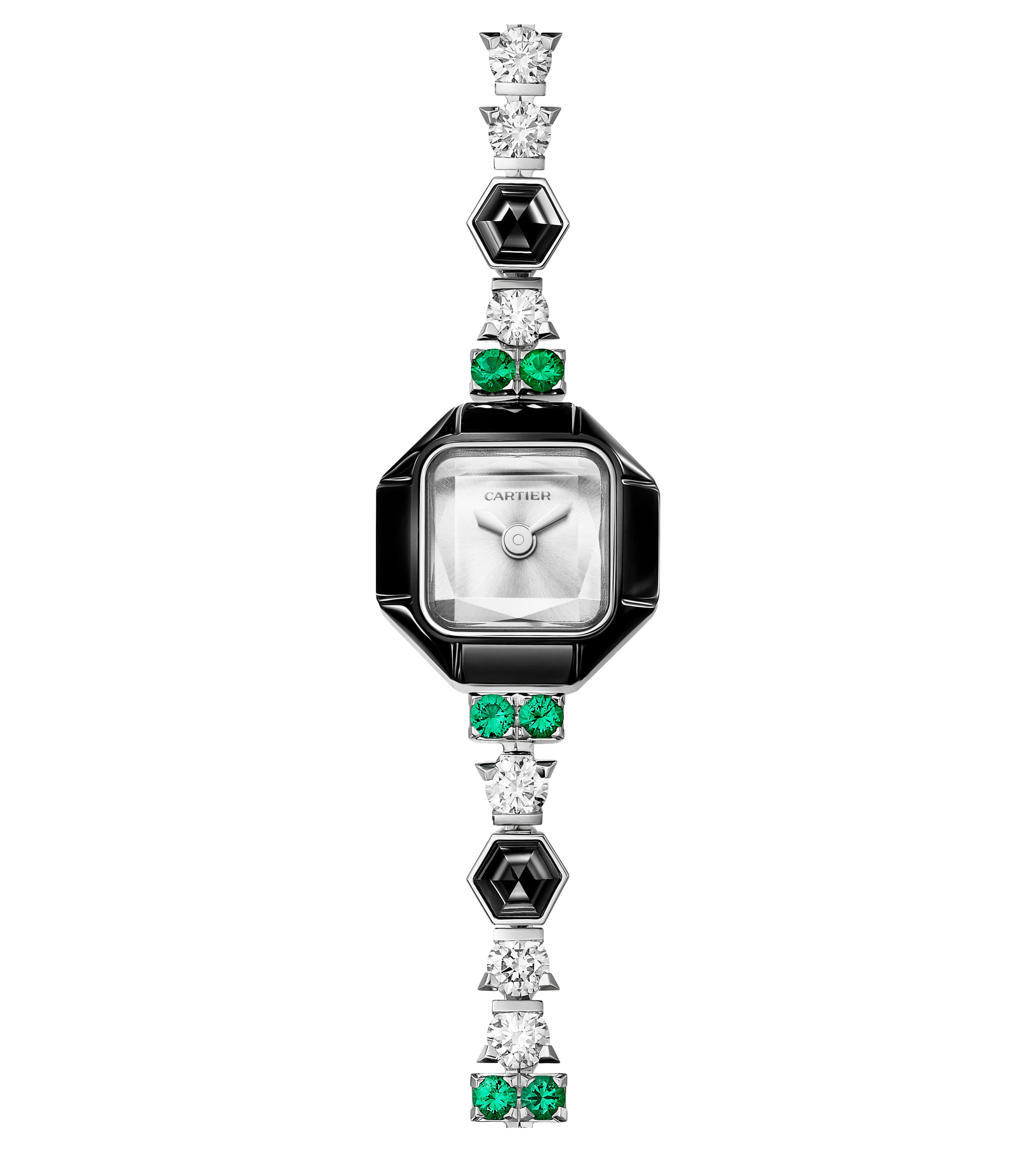錶帶由不同幾何形狀的鍊節組成,鑲嵌鑽石、祖母綠和縞瑪瑙,賦予這款腕錶精緻又多變的外觀。