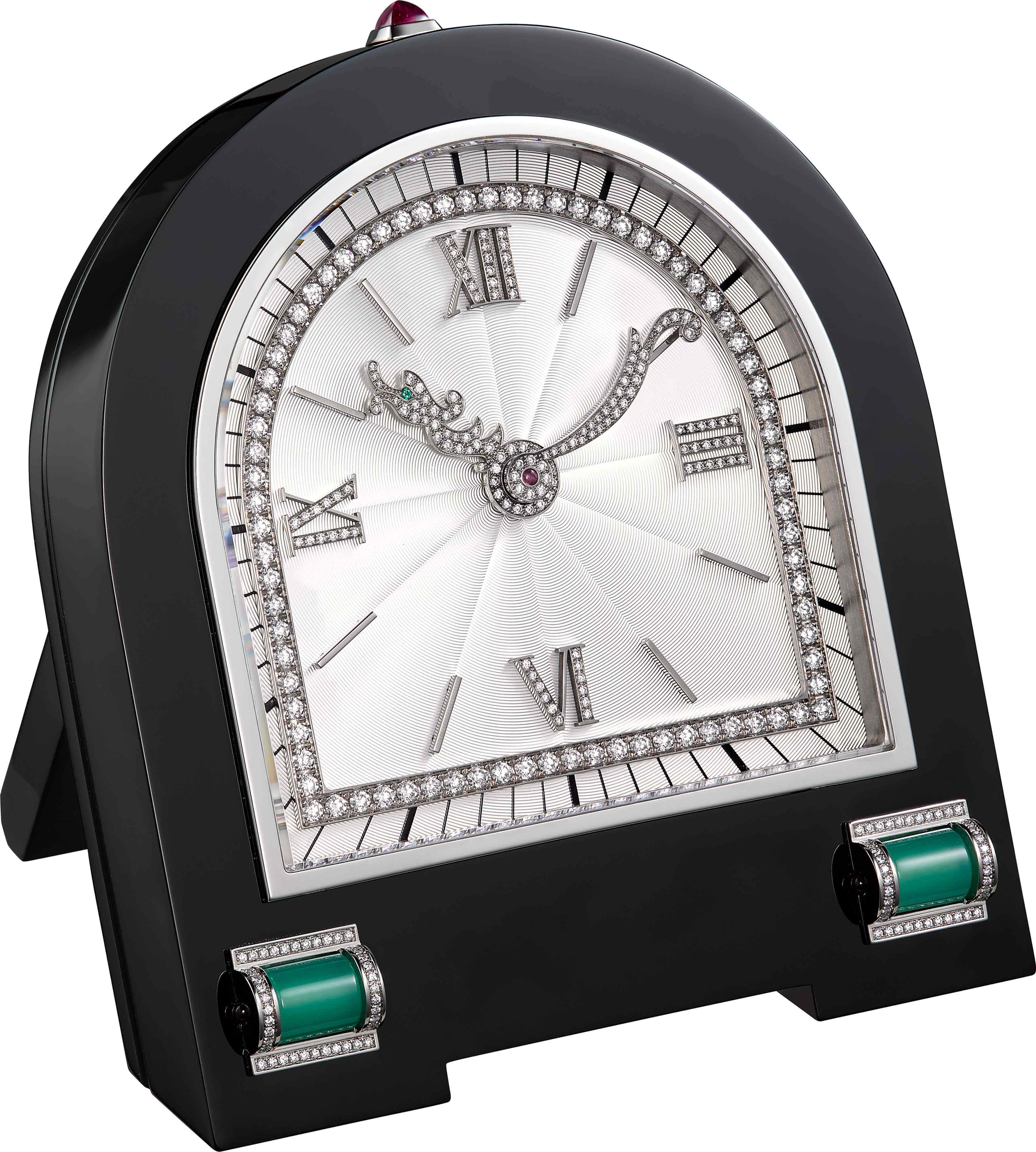 黑色與綠色是卡地亞經典的裝飾藝術色彩搭配:祖母綠、鑽石與縞瑪瑙。這種經典的裝飾藝術色彩組合,深受工作坊鍾愛。與外表上的幾何學設計完美搭配。卡地亞從1900年代開始進行大膽的創意實驗,探索色彩和材質的大膽對比。在這些色彩組合中,綠色和黑色的結合出現在1910年代初,並在接下來十年中被廣泛採用,成為卡地亞之家進行簡化造型和簡潔設計研究的特色之作。縞瑪瑙、漆或搪瓷的黑色通常用以產生微妙的陰影效果或突出其裝飾性,突顯綠色寶石的魅力,同時強調份量感和深邃感,並強化幾何形狀。此模式在裝飾藝術時期很快成為一種反覆出現的元素,在20世紀初期卡地亞成為此風潮的先驅。