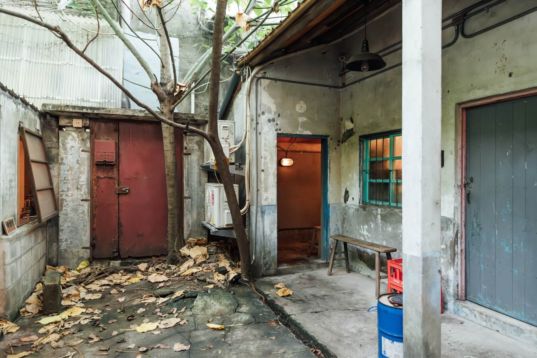 穿越側門走到後方,陽光從天井傾瀉,整理後餘下左右兩棵恣意生長的老樹,綠意幽靜恰如其分;原先的老宅廚房改建成洗手間,其餘則作為喫菸室及倉庫,還有一處開放的溫馨空間,不時有塔羅牌等占卜師進駐。