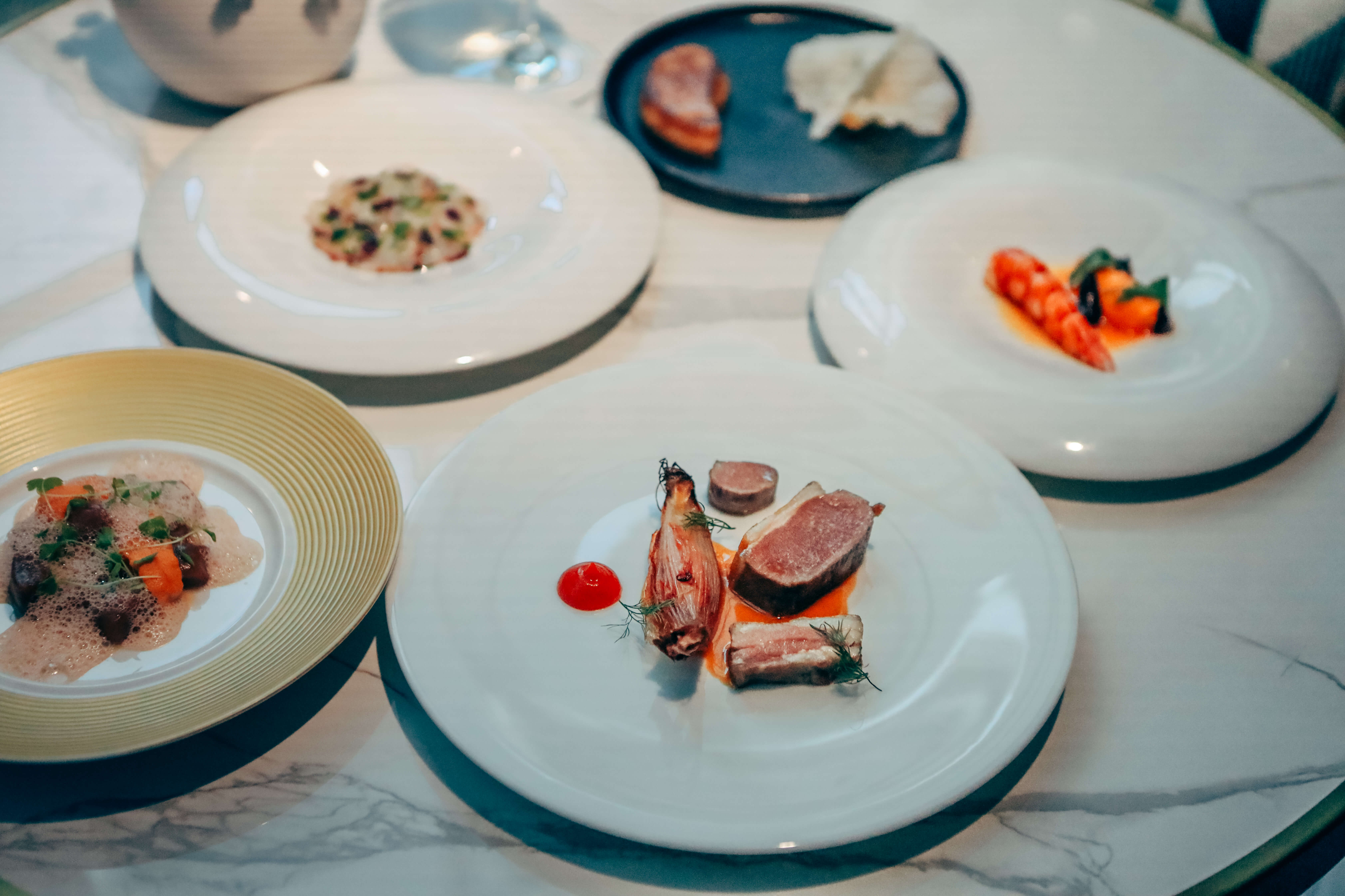 CEO1950的2020年秋季菜單,張億興設計了6道向老宅致敬的料理──冷前菜以章魚、甜豌豆及綜合香草搭佐山葵青豆泥,不同層次的綠創造了美好視覺,和洋食材結合,完美呼應了和洋風格的老建築;第一道熱前菜以鮮嫩鴨肝和法國聖米歇爾淡菜為主食材,疊加了形似CEO1950老屋瓦片的薄切小黃瓜,搭佐清爽微酸的檸檬奶油醬汁;第二道熱前菜則是當季蝦佐鮮甜的胡蘿蔔泥和微酸的奶油煎櫻桃,以酸模裝飾,搭配日本柚子、五葉松製成的醬汁;主食栗子麵疙瘩,Q彈的口感,淋上以蘑菇高湯打製的慕斯,每一口都帶來滿滿的驚喜;主菜源自台灣的「溫補」概念,三個不同部位的羊排,佐菠菜及酸甜黃辣椒泥,搭配炙烤羊骨燉蔬菜高湯製成的醬汁,平衡了油脂與鮮甜的好滋味;最後完美收尾的甜點,以焦糖蘋果、白蘭地及西芹茴香冰所組成,蘋果脫水後與白蘭地、奶油、香草莢一起慢炒入味,口感濃郁甘醇,是一道風格獨特的手作甜點!