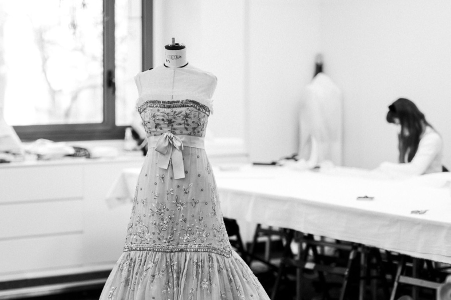 為完美重現黛安娜王妃的優雅身影,香奈兒Lesage刺繡工坊與Lognon褶飾工坊費時1034小時,由五名專責工匠共同打造,重新復刻香奈兒1988春夏高級訂製服系列。