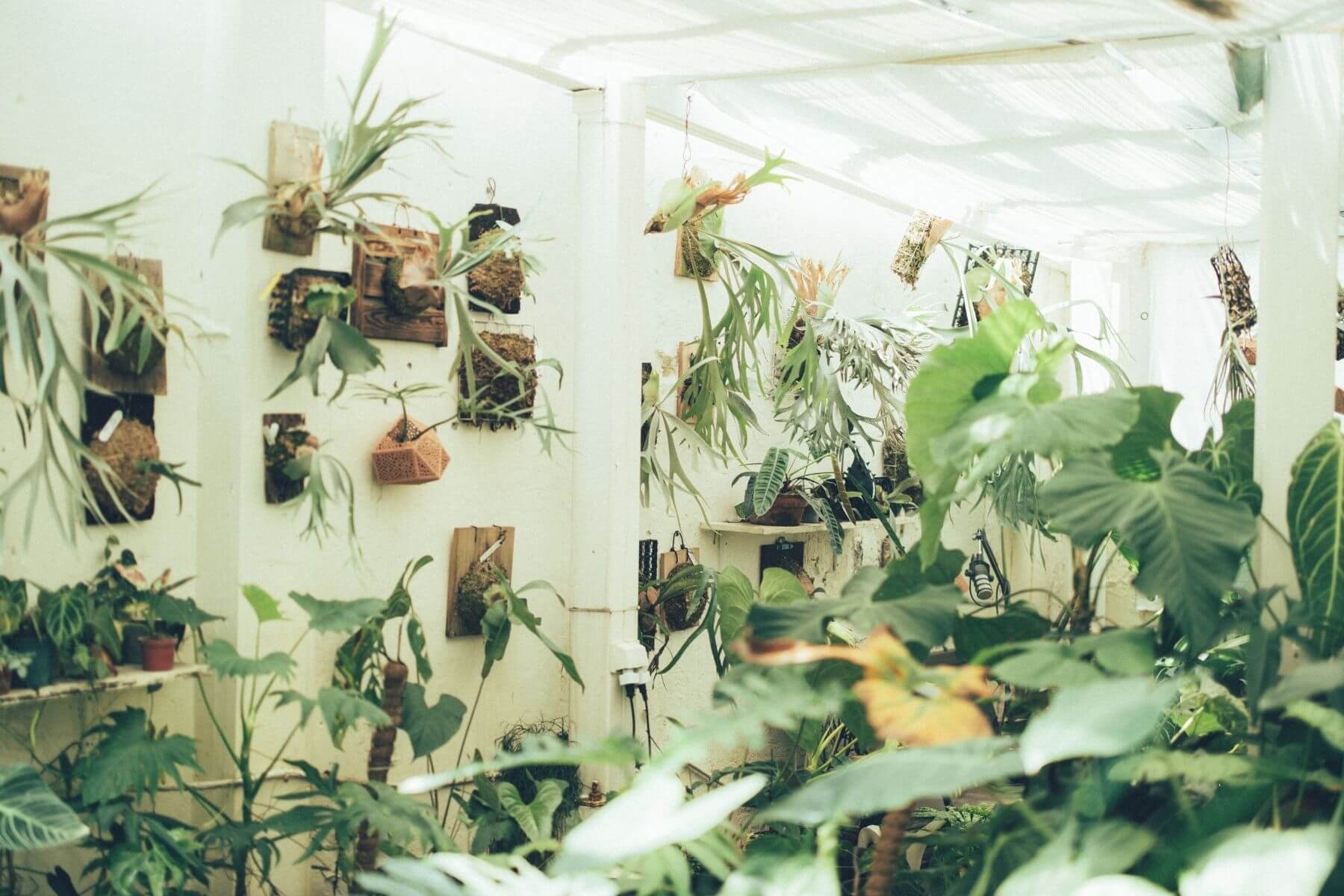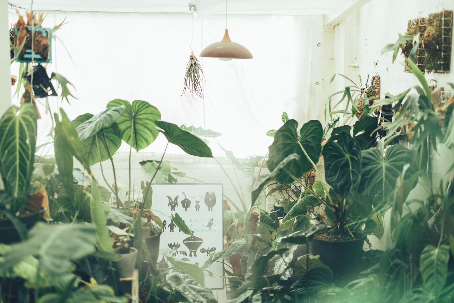 走出捷運站,一面清爽的綠意襲來,那日陽光正好將葉面曬得一閃一閃,穿越大安森林公園,來到日目視覺藝術共同創辦人陳普的工作室。外觀是一棟普通的公寓老宅,步登細陡的樓梯來到3樓,辦公桌旁的露台竟藏著一片令人驚嘆的都市叢林,放眼望去純白一室,陽光灑在透光板上,滿室植物展現深淺不一的綠,適時噴灑的水霧為空間蓋上一層淡白濾鏡,有種超現實的夢幻。