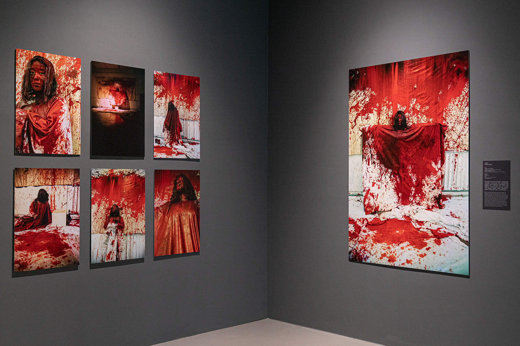 塩田千春,《成為畫》,1994,行為藝術、裝置(紅色瓷漆)|2019,數位輸出,166×110 cm/72×48 cm × 6。(圖/林冠名攝影)