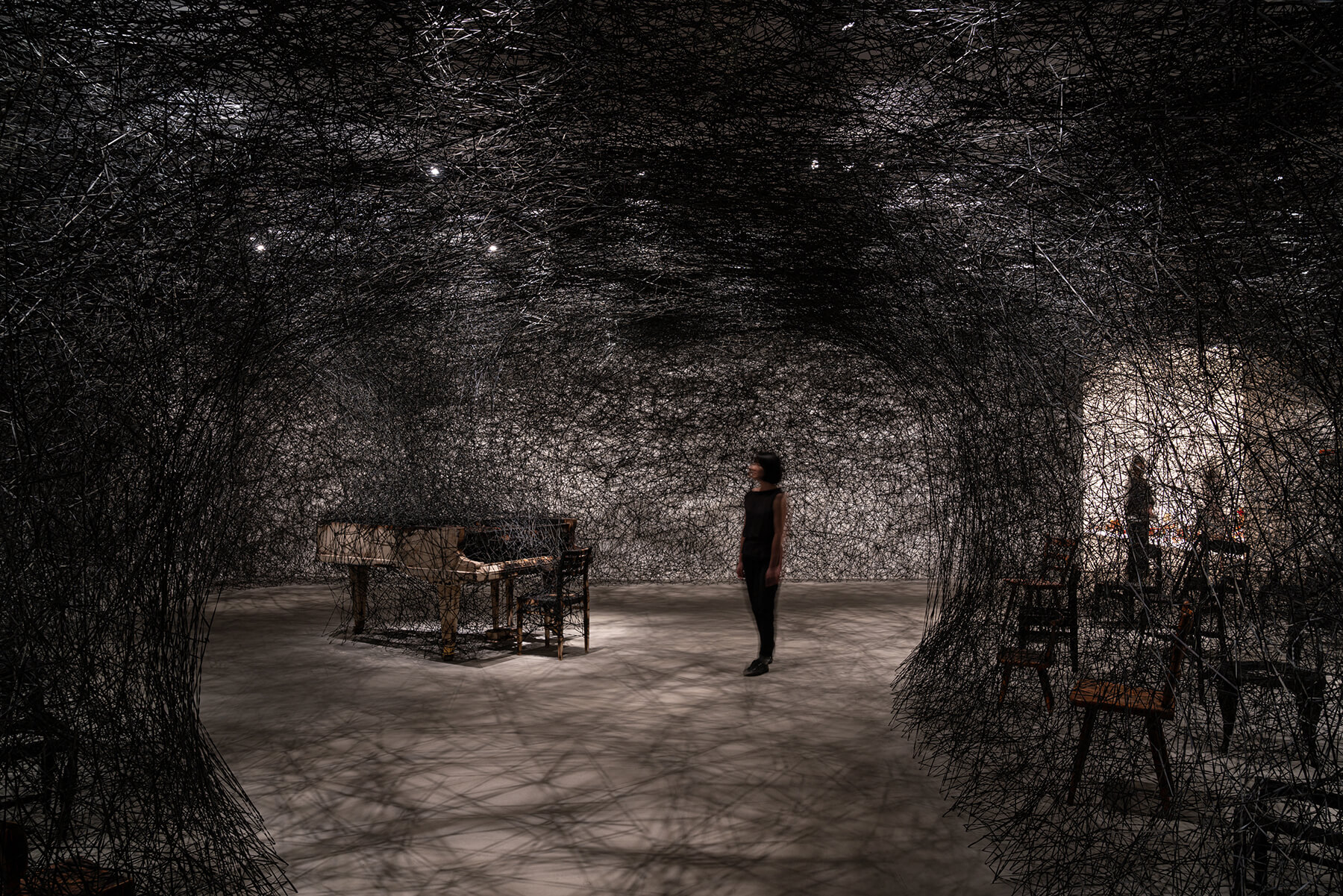 黑色的巨網猶如蜘蛛絲,蔓延到許多物件上,包括幼時她的鄰居家失火燒得只剩骨架、再也發不出聲音的鋼琴;以及她住在德國三年內搬了九次家,在一張又一張陌生的新床上輾轉難眠的日子,皆封存於自己創造的黑色宇宙中,像是夜空中一個個巨大,靜謐且美麗的標本。