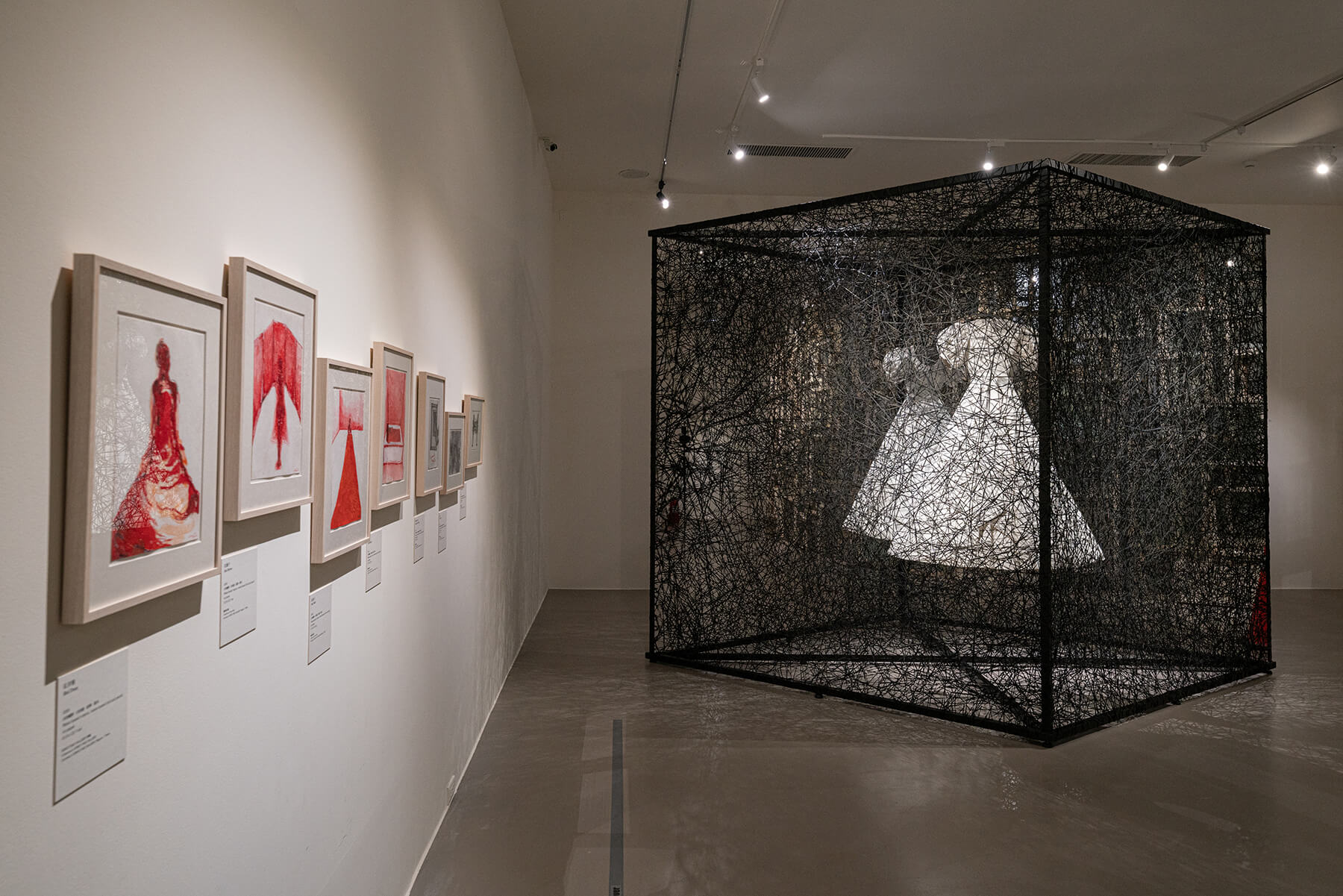 塩田千春,《時空的反射》,2018,白洋裝、鏡子、金屬框、Alcantara黑線,280×300×400 cm。(圖/林冠名攝影)
