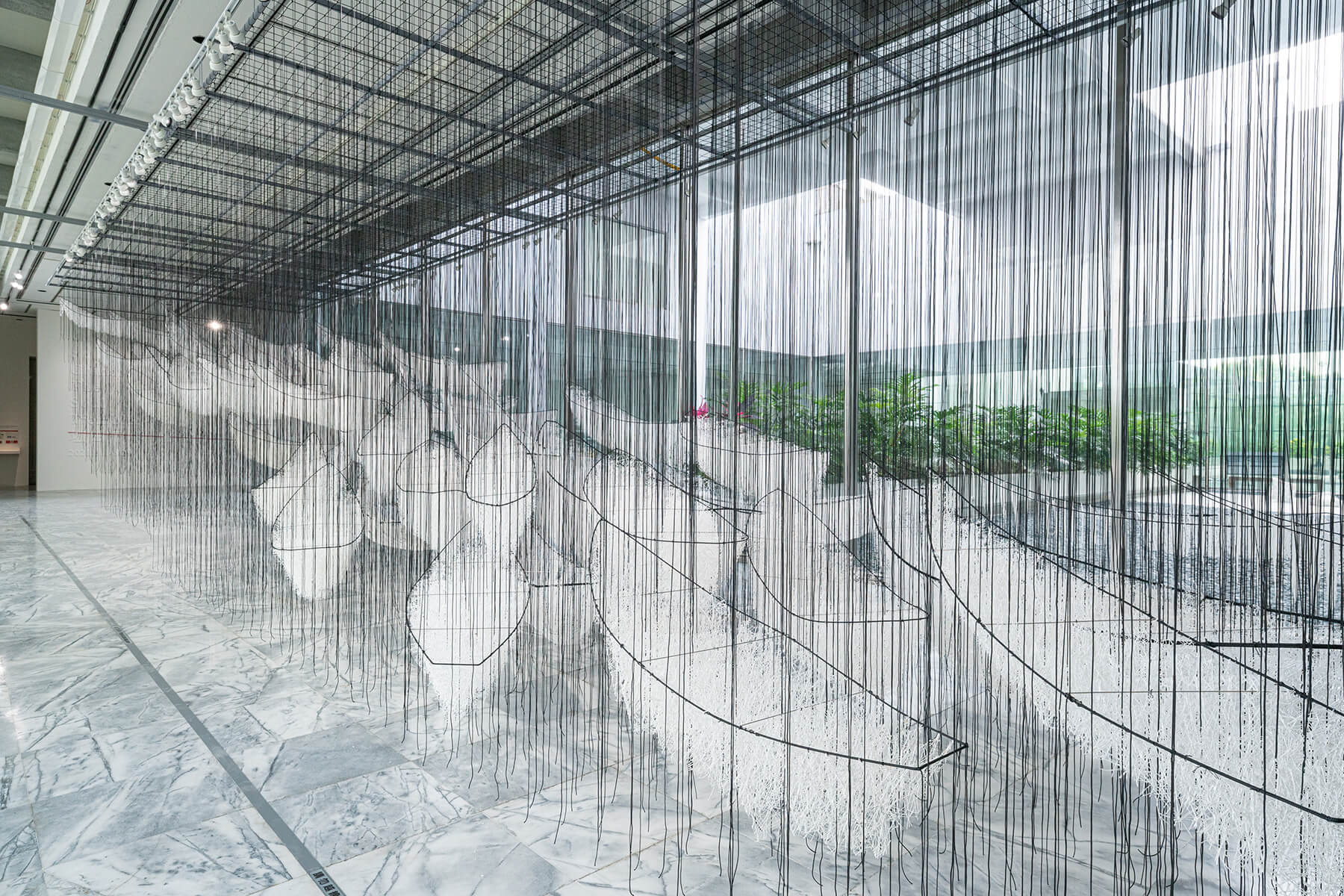 塩田千春,《去向何方?》,2017/2021,白毛線、鐵絲、繩子,尺寸依空間而定。(圖/林冠名攝影)