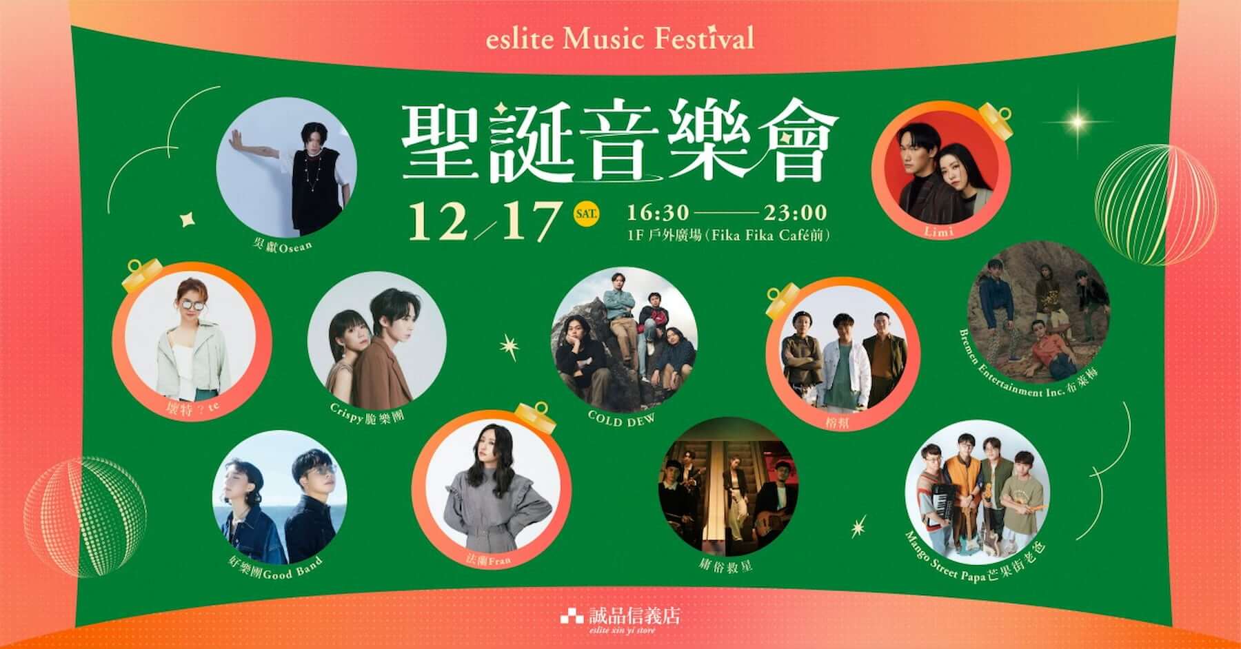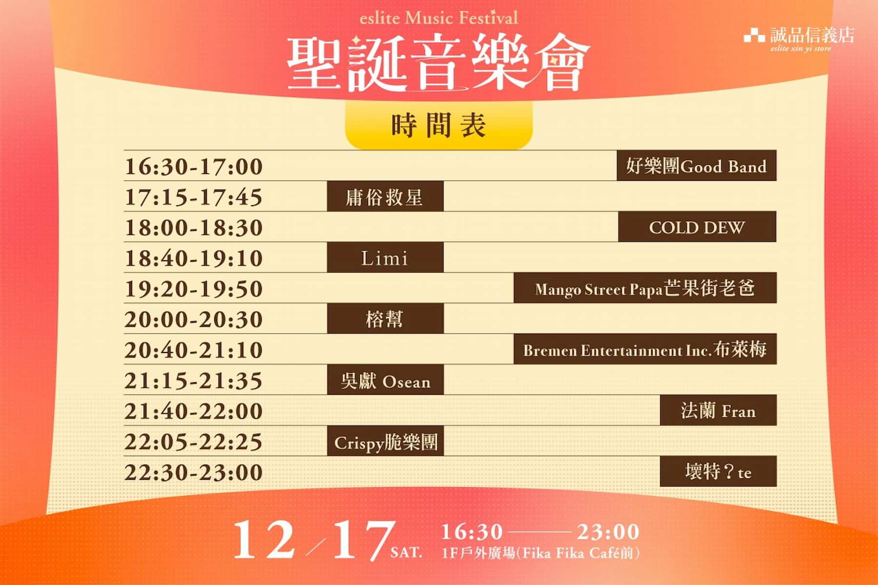 ㄧ年一度最令誠品生活人期待的聖誕音樂會將在12/17 美好的週六下午登場! 自 16:30 開始,11組藝人、樂團接力在誠品信義店 1F 戶外廣場(Fika Fika Cafe 前)演唱,有以《我把我的青春給你》一曲廣為傳唱的好樂團 Good Band、曾提名最佳演唱組合的Crispy脆樂團,以《親愛的房客》獲金馬57 最佳原創電影音樂的法蘭 Fran 以及第32屆金曲獎最佳新人壞特?te,期待在年末之際能將美好的音樂介紹給各位。活動自由入場,一起炒熱冬季氣氛,開心搖擺迎接聖誕節,以喜歡的音樂為2022年劃下美好的句點。