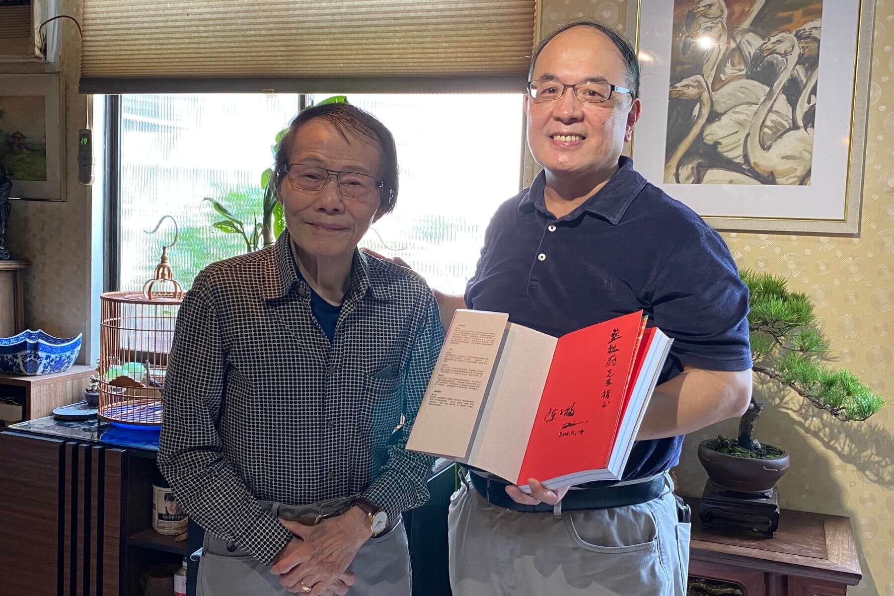 國家影視聽中心董事長藍祖蔚(右)邀請陳子福先生(左)於專書《繪聲繪影一時代:陳子福的手繪電影海報》簽名留念。(圖片/國家影視聽中心提供)