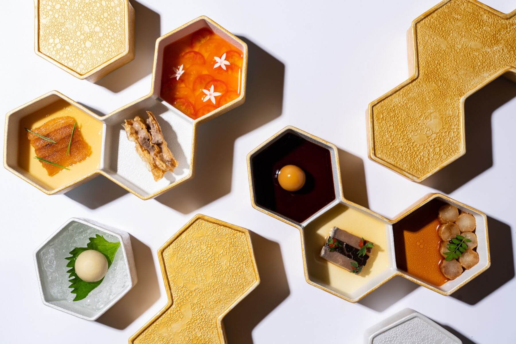 宴客辦桌時、圓桌轉盤上常見的小菜作為靈感設計的「七巧板」,盛裝著梅漬蕃茄、雞卷、紅燒茄子、醉鮑魚、溏心蛋、紅油豬耳。有別於傳統法餐體驗,會停留在桌面上與接下來的開胃菜交會,讓客人在家人友伴的閒談之間緩緩享用,或與其他料理隨個人喜好相互搭配,悄悄地延長了華人寒暄問暖、閒話家常的輕鬆自在。