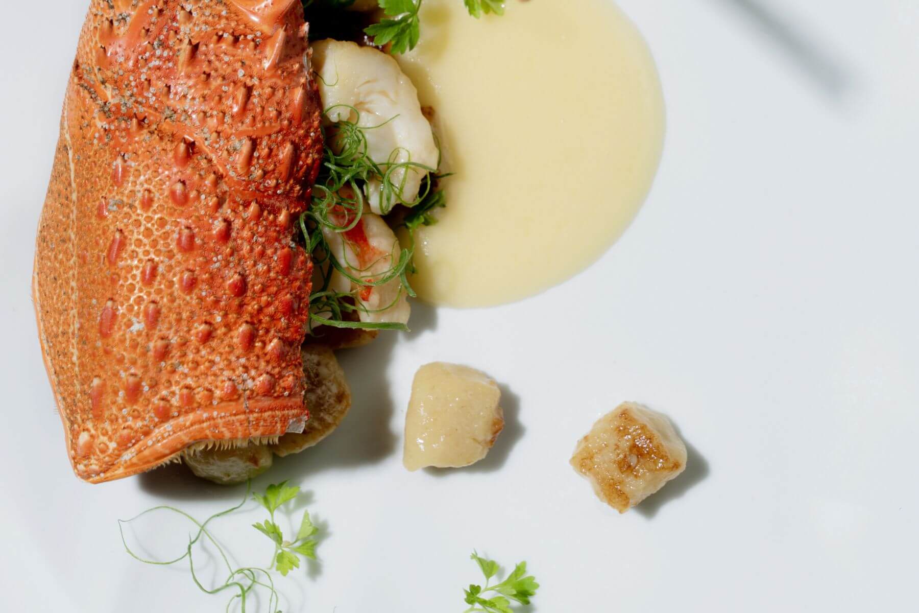 主餐「團團圓圓」分為兩道菜,一是來自香港非常經典的海鮮麵食「龍蝦伊麵」,主廚將經過上湯烹調的龍蝦,放在將麵粉與雞蛋和勻後油炸的伊麵上,吸收龍蝦湯汁精華後的伊麵越煮越香且麵體不糊。而主廚特別將麵條中的麵粉、大蒜、奶油的比例進行調整,將「伊麵」改以「義式麵疙瘩(Gnocchi)」形式呈現,風味上的中西合璧,對應著當代遊子在全球化的過程中,串連起跨文化的友誼象徵。