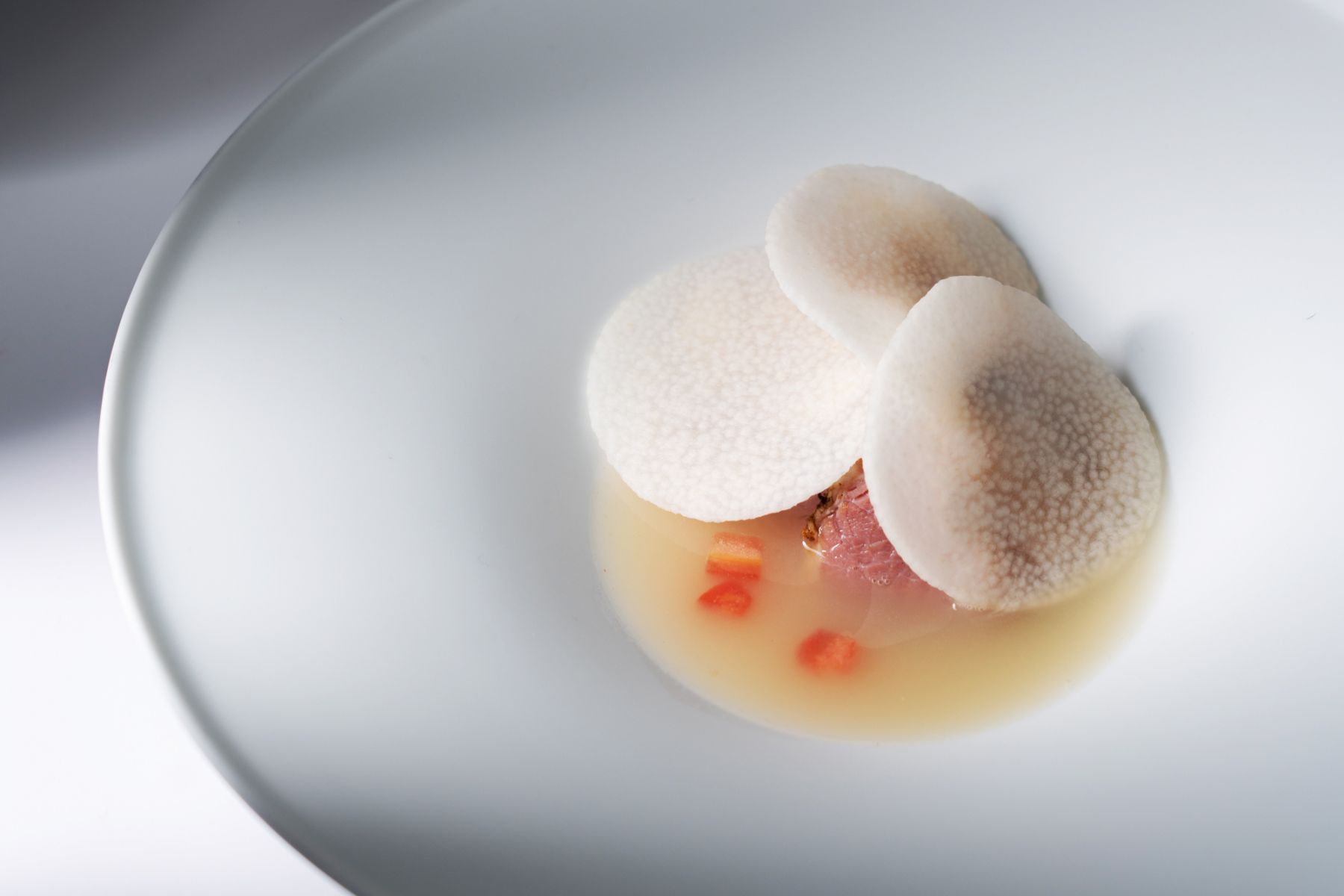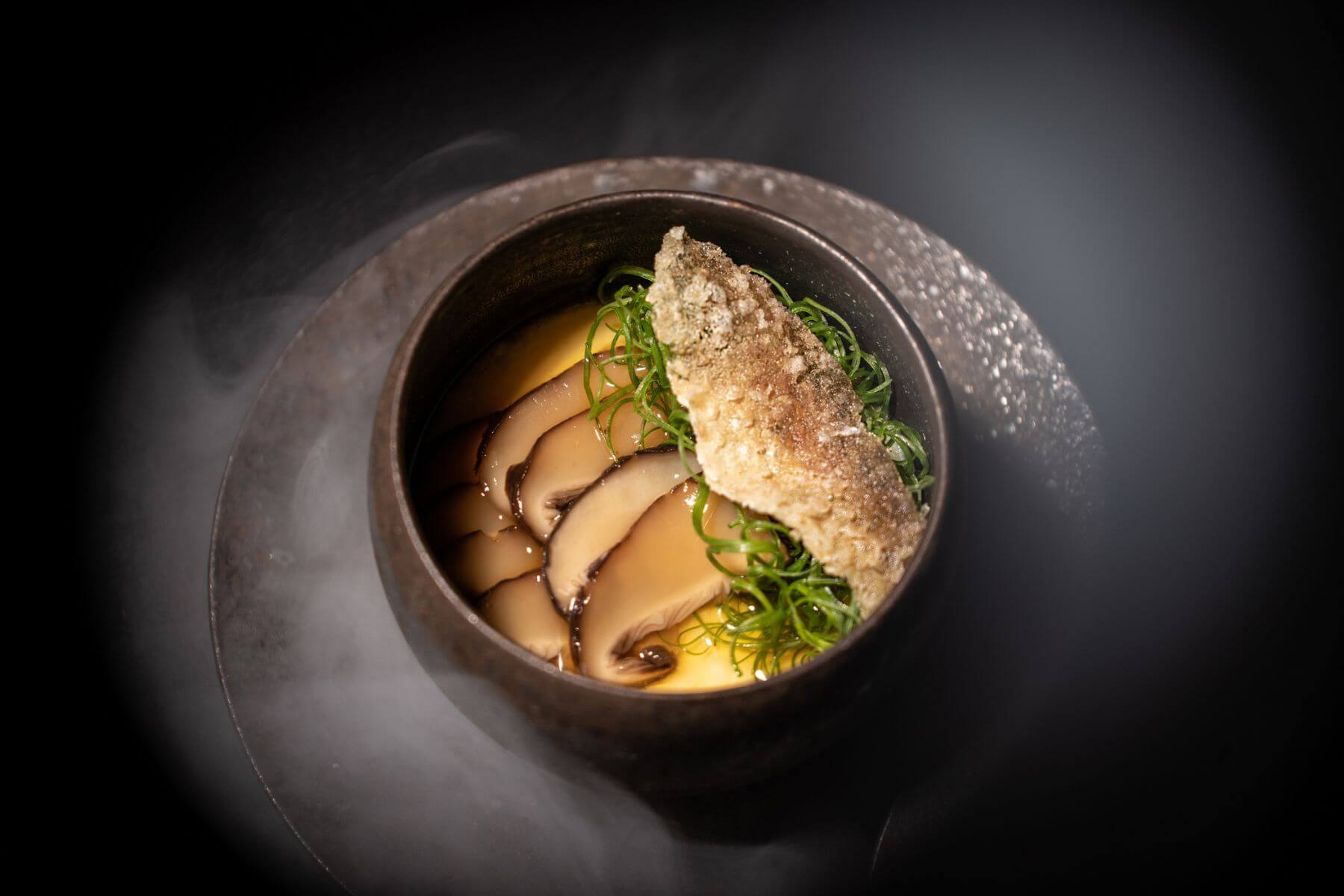 「回甘」也是Circum-主廚羅偉誠梳理回憶、層層堆疊出兒時的甘美滋味。每次和父母去吃辦桌,鮮美回甘的羹湯總是他最期待的一道菜。於是他使用兩種不同的風乾魚皮,在分別經過泡發與酥炸後,搭配鮑魚高湯的蒸蛋,再用層層堆疊的花菇加乘時間孕育的鮮美滋味,一湯匙舀下入口,回憶便在舌尖上散開,暈染成回憶裡最暖的光。