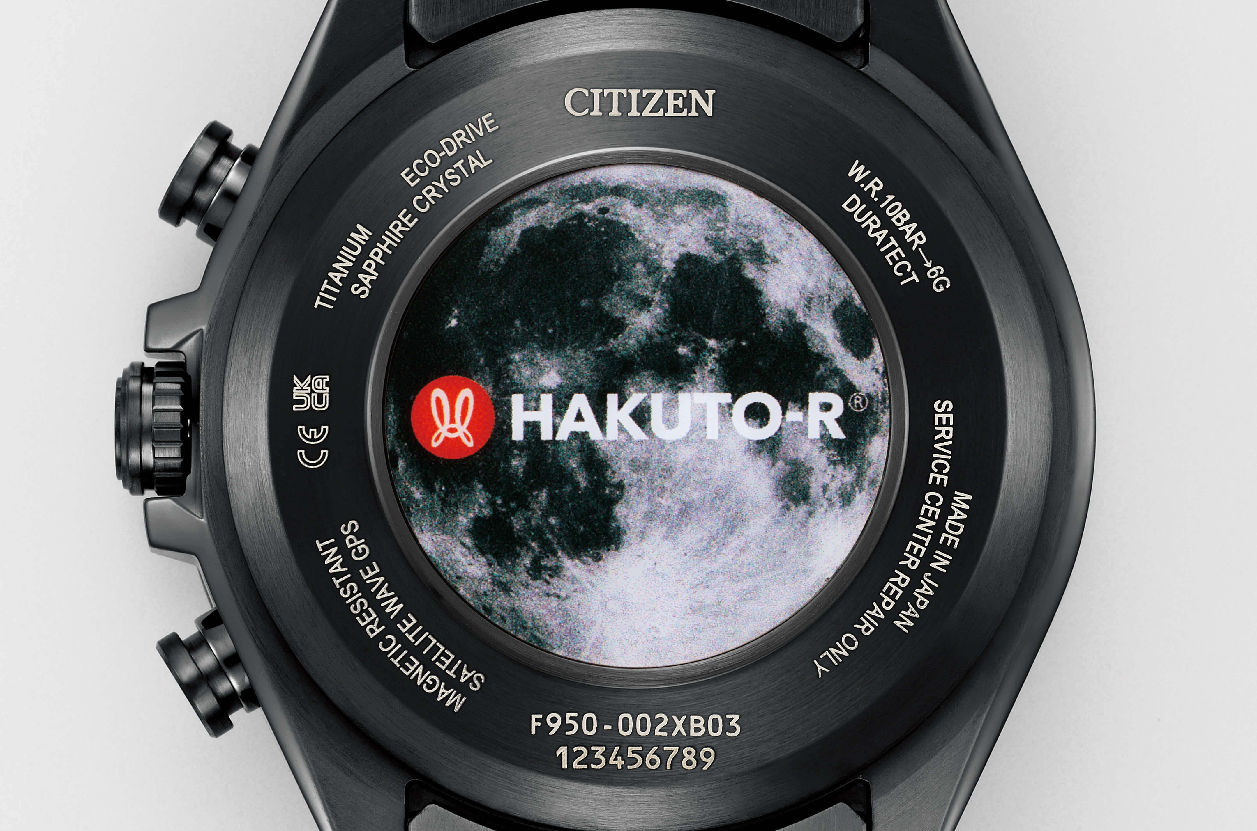 CITIZEN光動能GPS衛星對時錶HAKUTO-R限定款CC4067-66E,搭載F950機芯全殼款採用代表宇宙黑暗的DLC黑色電鍍,錶帶的中央錶節使用將鈦高溫處理、再冷卻後呈現不均勻的結晶化現象的鈦結晶,讓每只腕錶都有其獨特紋路。錶盤則以鈦結晶為發想,仿照實際鈦結晶呈現出的凹凸來呈現,觀賞時的角度不同,看的錶盤模樣也不一樣。黑暗的宇宙其盡頭也是會有光,依此印象除了用全款黑色錶殼錶帶來代表宇宙外,其遠處的光芒便利用特殊鍍膜技術的藍寶石錶圈來表現,加上銀色時標及三針,讓整只錶款黑中帶有光亮也更有層次,背底蓋更大膽放上月球與HAKUTO-R logo,作為此次GPS衛星對時錶的特別設計。無論是最速衛星對時功能,還是超級鈦再到鈦結晶技術,CITIZEN持續致力於對世界有貢獻的腕錶。