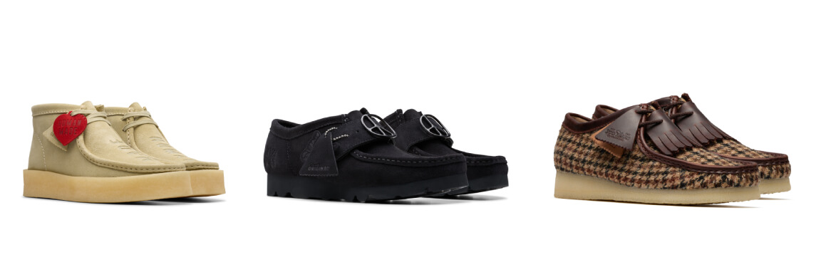 在品牌200週年之際,集結多款與國際潮流品牌合作的聯名袋鼠鞋作品,包含與日系街頭品牌 HUMAN MADE 聯手推出的 WALLABEE MADE,保留經典鞋型與配色,並在鞋面、鞋墊與皮革吊牌上融入品牌標語與 LOGO,細節展現獨到巧思與品牌態度;以及與 NEEDLES 攜手打造的限量聯名款,將其標誌性和平標誌轉化為可調節金屬扣,並於後跟印上招牌蝴蝶圖騰,完整詮釋雙方品牌語言與工藝細節。使用英倫經典面料 Harris Tweed 打造的莫卡辛鞋型,以 100% 蘇格蘭手工羊毛織品搭配生膠大底,傳遞極致舒適與歷史質感,為 Wallabee 注入跨時代風格與文化深度。