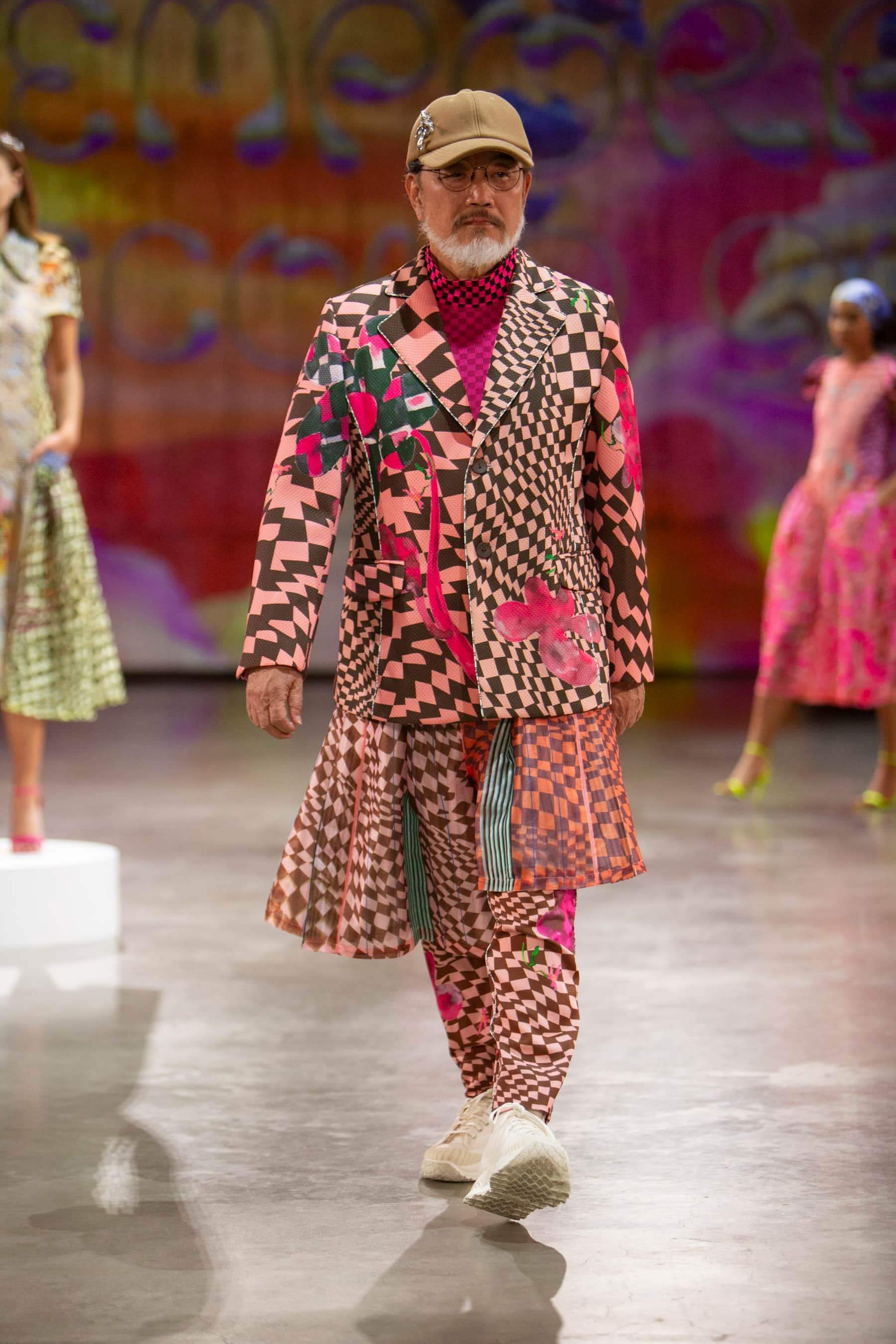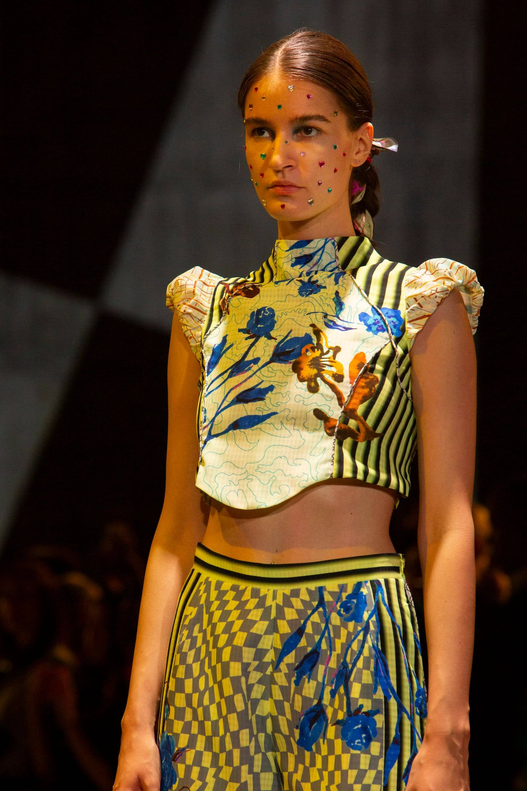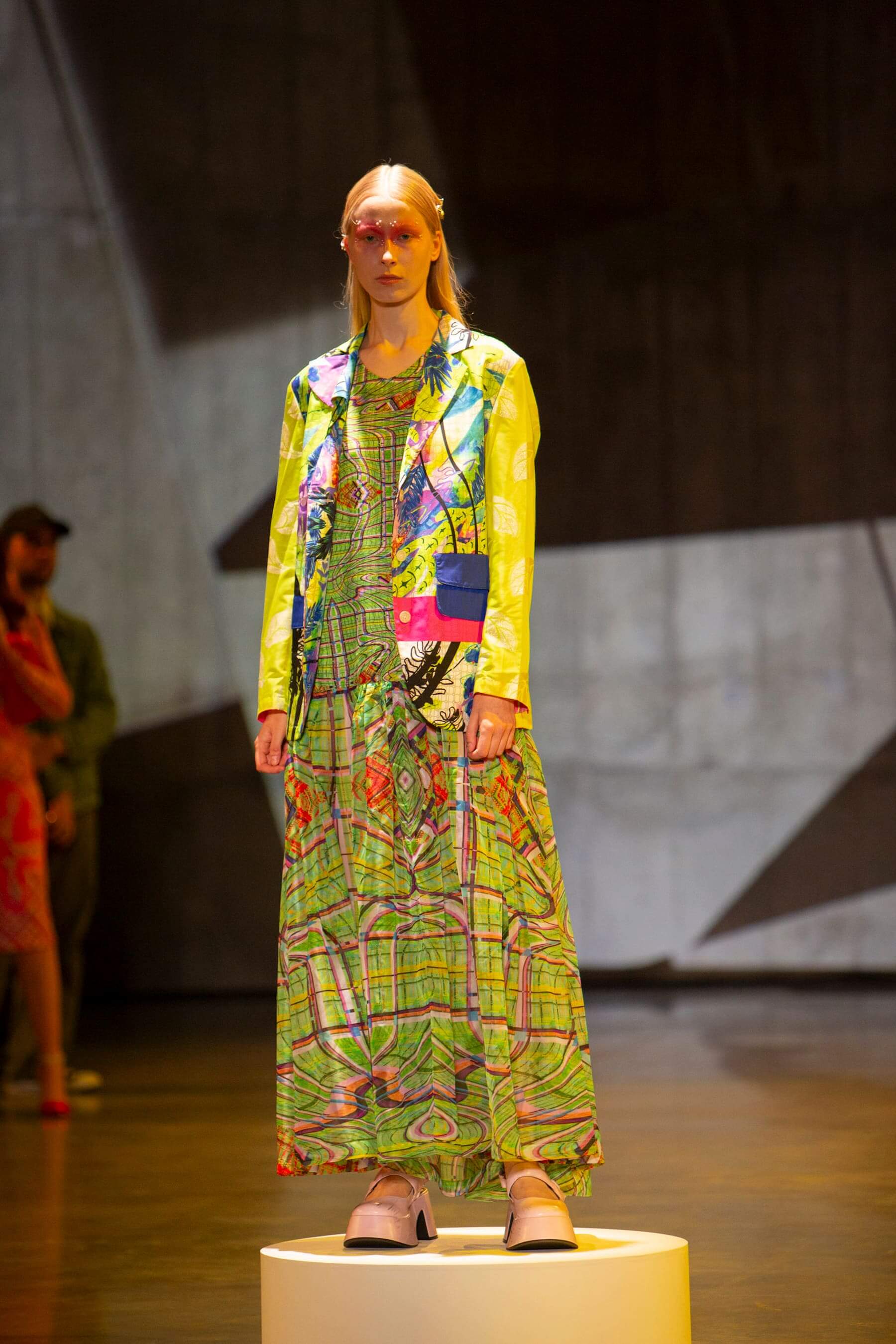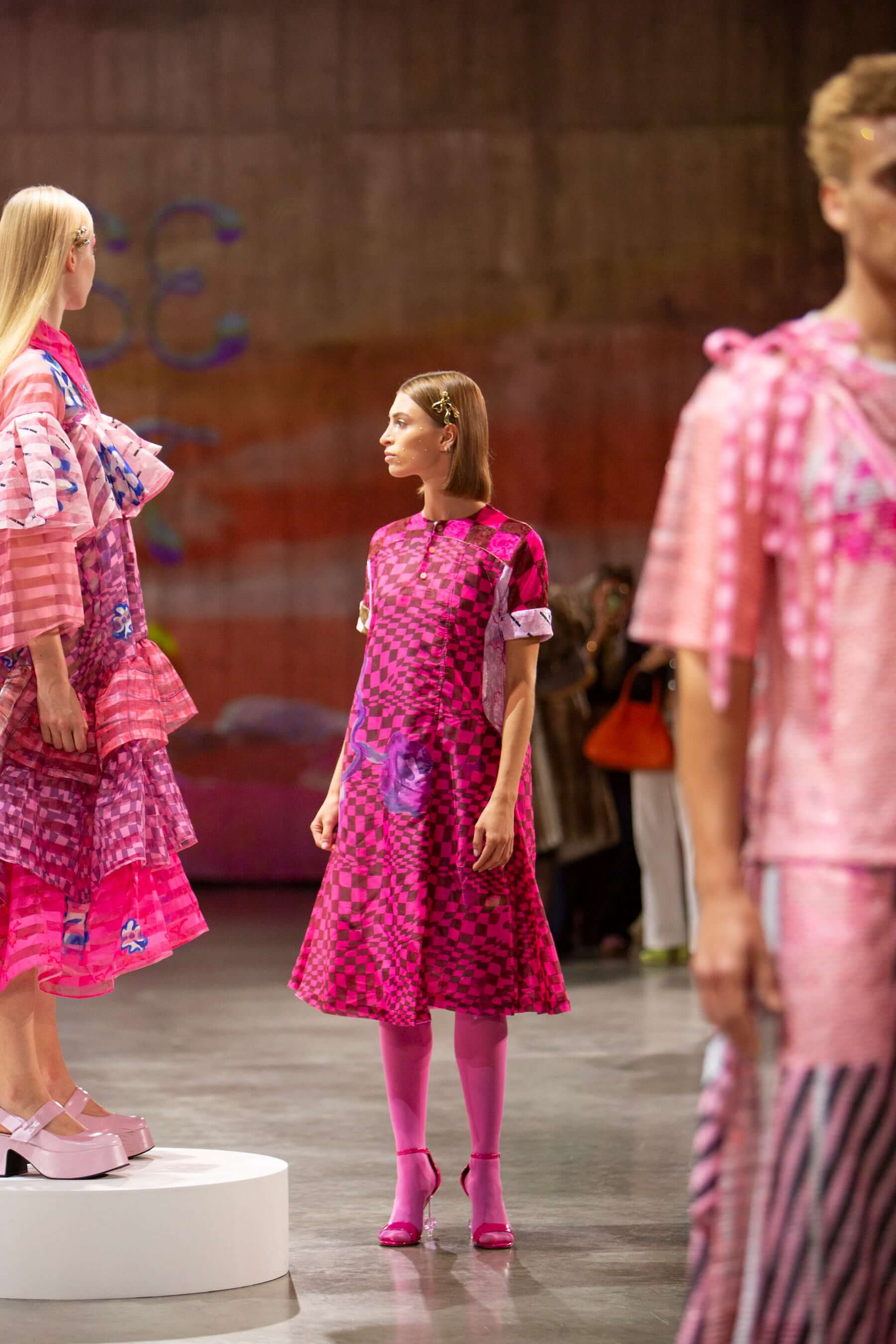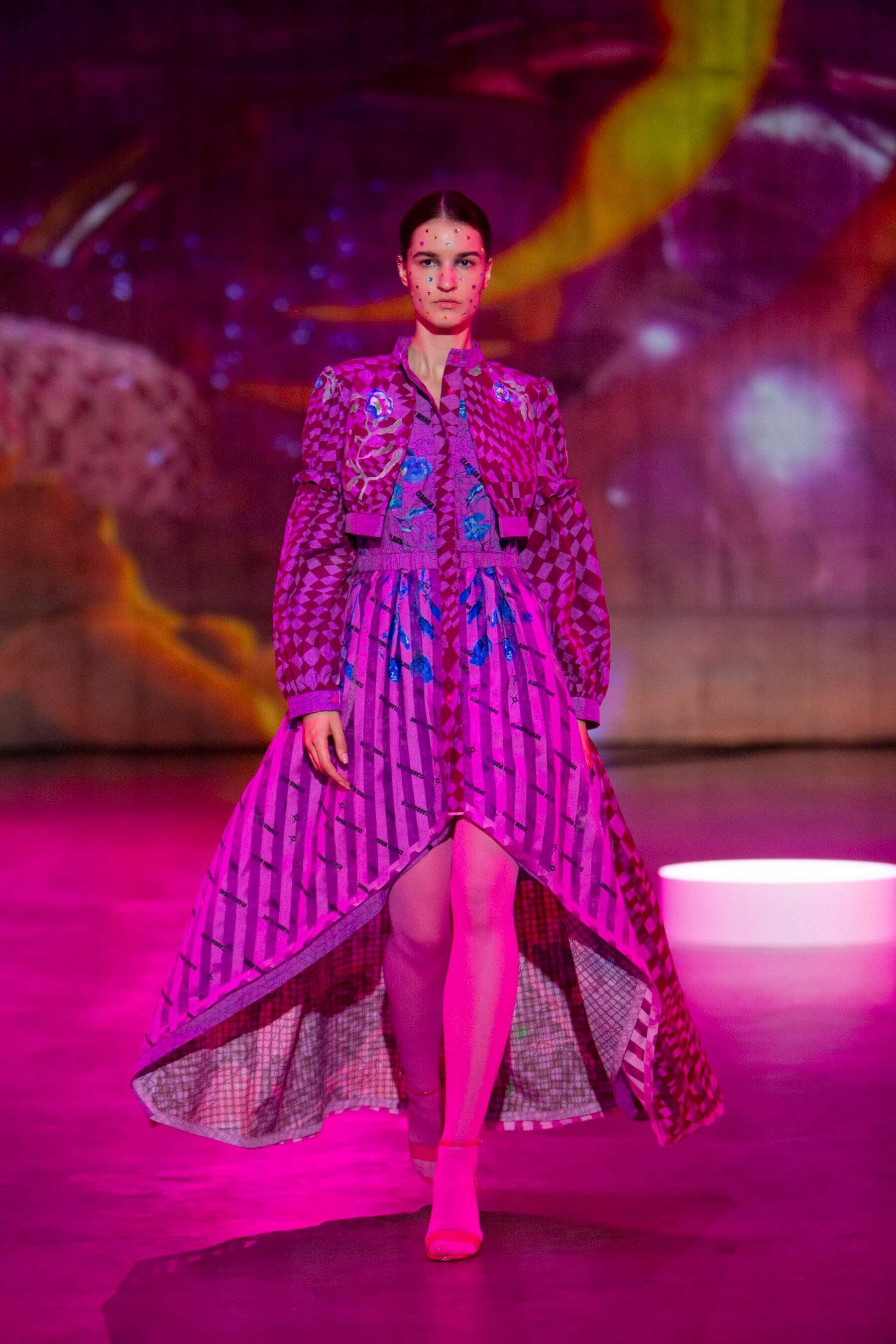 整體設計特色延續品牌DNA,採用立體剪裁,強化以花苞裙襬、泡泡袖、高墊肩等元素呼應主題,同時延續品牌對永續與環保訴求的尊重,採用數位印刷與環保面料,創新使用全新技術直接於多層次緹花布料、甚至亮片上直接彩色印刷,完美呈現設計師多彩繽紛的設計。其中,引人注目的方格圖樣,亦正呼應著虛擬實境中穿越過去、現在與未來的時空跳躍走道。