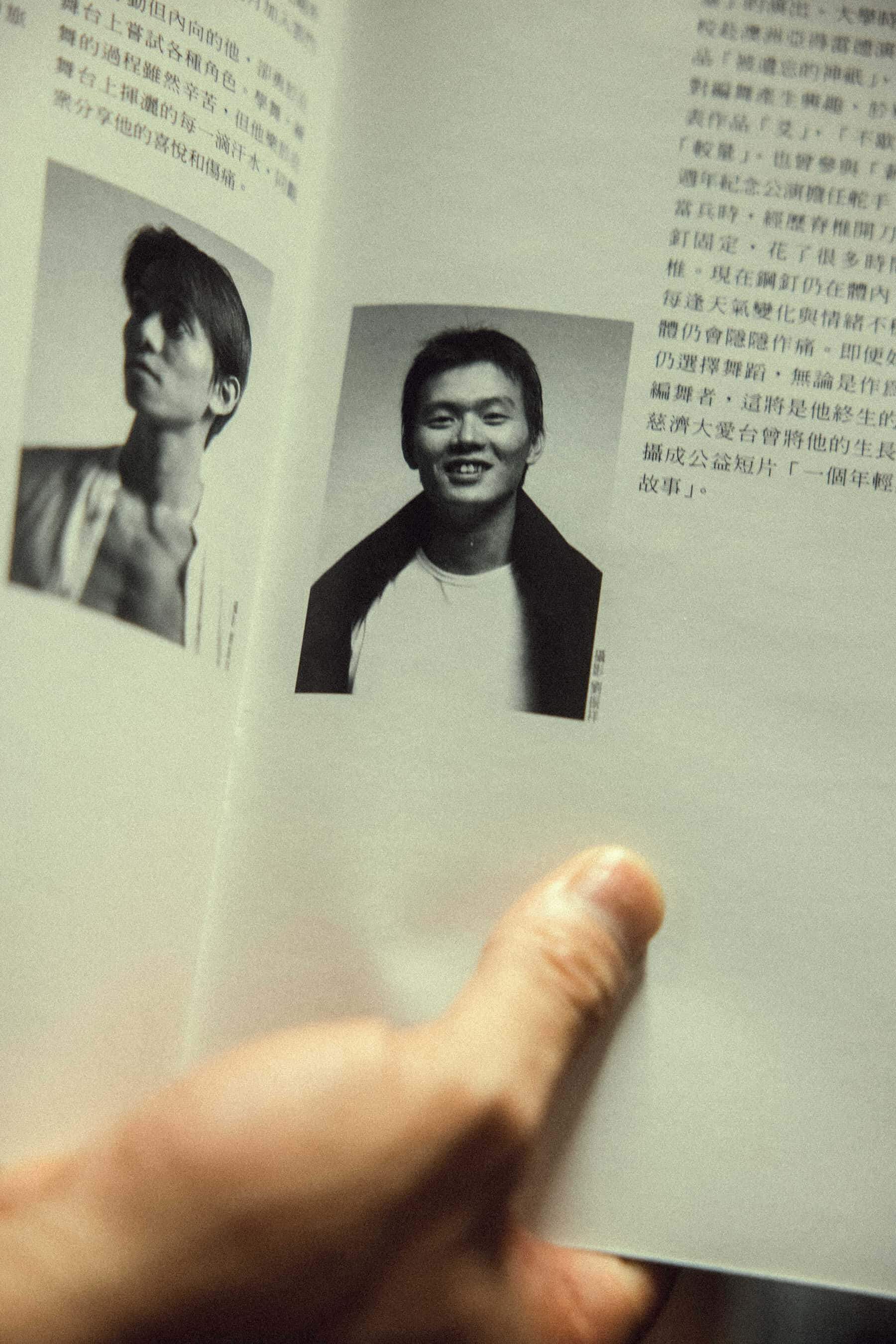 鄭宗龍從比人還高的層架之上,抽出一本冊子,順手一翻,書頁內竟是他2002年考進雲門舞集時的新人簡介。照片中的他,頭髮仍烏黑,笑顏還青澀,見到20年前的自己會不會起雞皮疙瘩?他開玩笑地說,「有一點被自己帥到。」