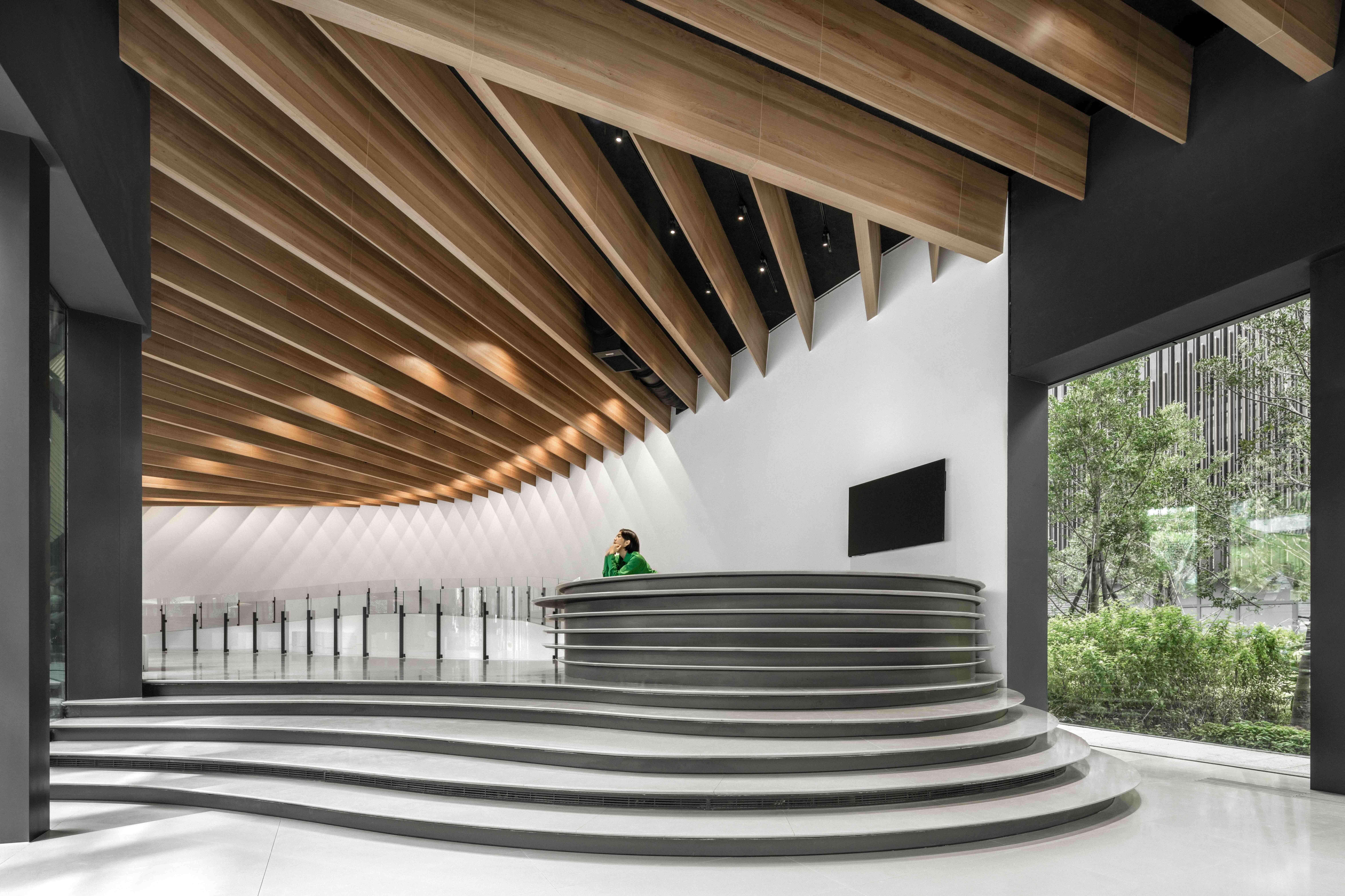 建築本體選用鋼構工法,不僅展現出較傳統混凝土更為輕盈柔韌的質地,也在環保永續上跨出重要一步。這座橫跨地上地下各一層的建築,以410坪的綠意屋頂為皇冠,從穩重的門型基座出發,緩緩舒展出優美的曲面。無數精心計算的小三角鋼板,如同大自然的基本粒子,以點線面的律動堆疊出起伏自然的山丘輪廓。為了呼應草悟道的綠意氛圍,建築團隊更巧妙地融入1,282根獨特的木紋格柵,為剛硬的鋼構注入溫潤質地。大片落地窗的設計則打破內外界線,讓空間與自然相互滲透,創造出無邊際的視覺延伸。