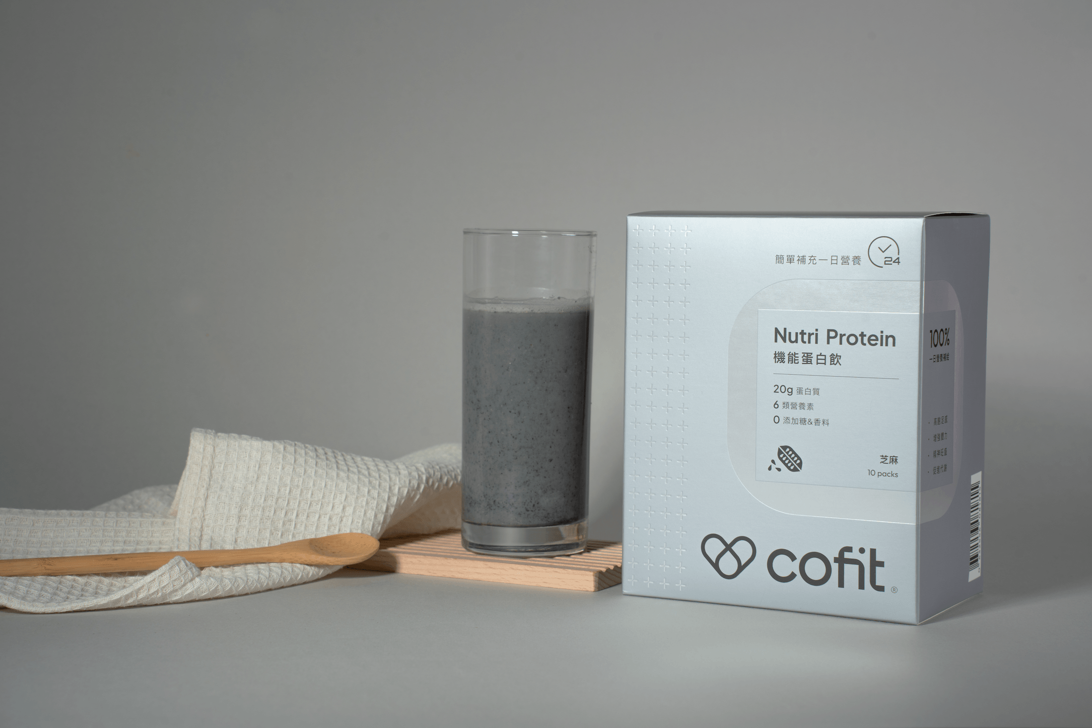 首波推出的「芝麻高蛋白堅果飲」,以無糖豆漿為基底,加入 Cofit 機能蛋白飲,並搭配純芝麻粉與堅果燕麥,帶來濃郁芝麻香與滑順豆奶風味,入口還能感受到堅果燕麥的細緻顆粒口感,香氣溫潤不甜膩。
