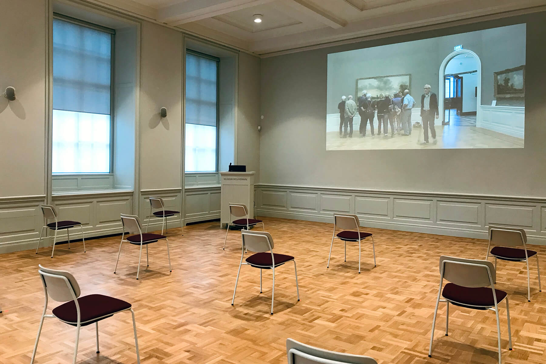 上圖為阿姆斯特丹人行道上的告示「請維持1.5M社交距離」;下圖美術館講座現場,坐位也間隔1.5M。