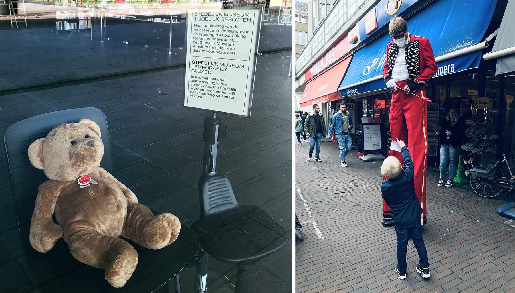 圖左為疫情中暫時閉館的阿姆斯特丹市立美術館,只有熊寶寶坐鎮;圖右為軟性封城的荷蘭街景。