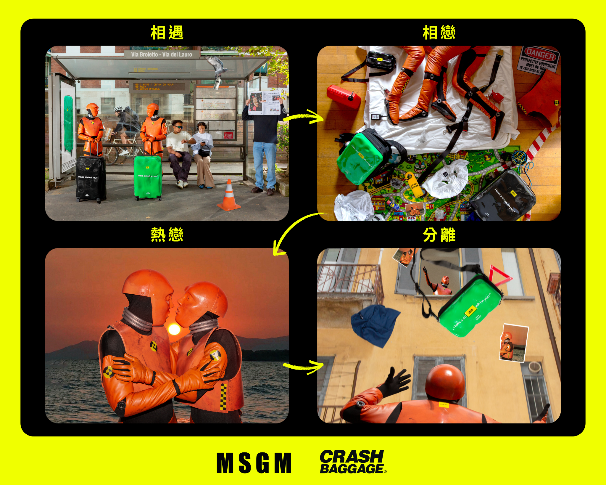 有趣的是,Crash Baggage與MSGM也因為此次的合作而特別邀請加拿大知名攝影師Kyle Berger操刀拍攝形象廣告。廣告中兩個撞擊測試假人為主角,模擬戀愛的邂逅、約會、與分手過程,具體化愛的衝擊力 ,傳遞「I Have a Crash on You」的概念,不僅捕捉了情感碰撞的張力與複雜性,更傳遞了愛、韌性與對未來希望的訊息。