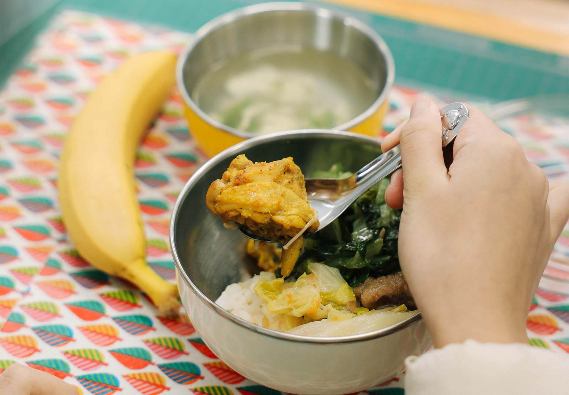 午餐時間來到新北市新莊中港國小的教室,學生打開不鏽鋼飯箱,氤氳蒸氣散去,今天的主菜是越式咖哩雞。以越南咖哩粉、香茅、砂糖、魚露和椰漿調配而成的薑黃色醬汁,包裹雞肉、炸地瓜和炸芋頭,混合成獨特鹹香氣味,讓人食指大動,「有吃到椰奶的味道!」有別於過去習慣吃的日式咖哩,學生們細細品嘗這道味蕾豐富的越式咖哩。