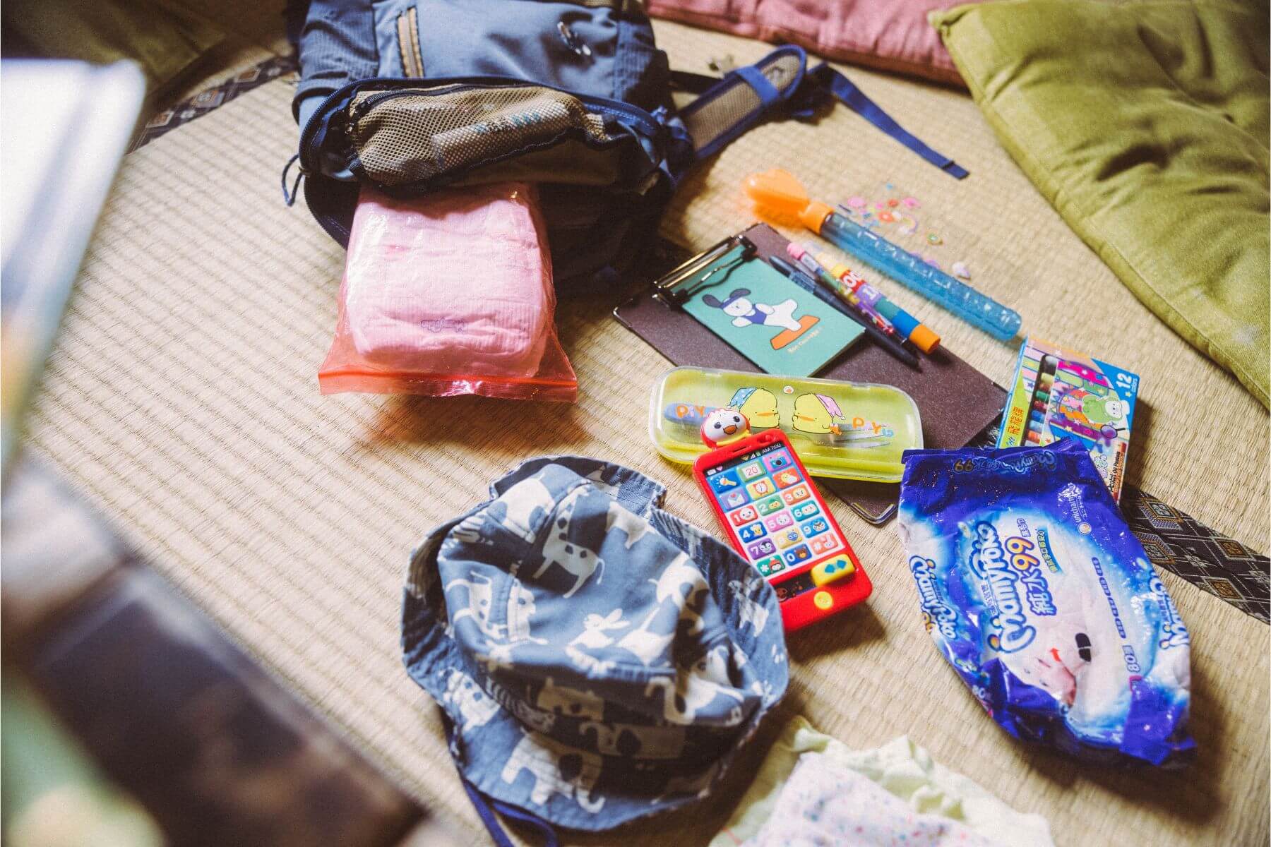 檸檬的「爸爸包」常備物品:濕紙巾、尿布、餐具、玩具、蠟筆。