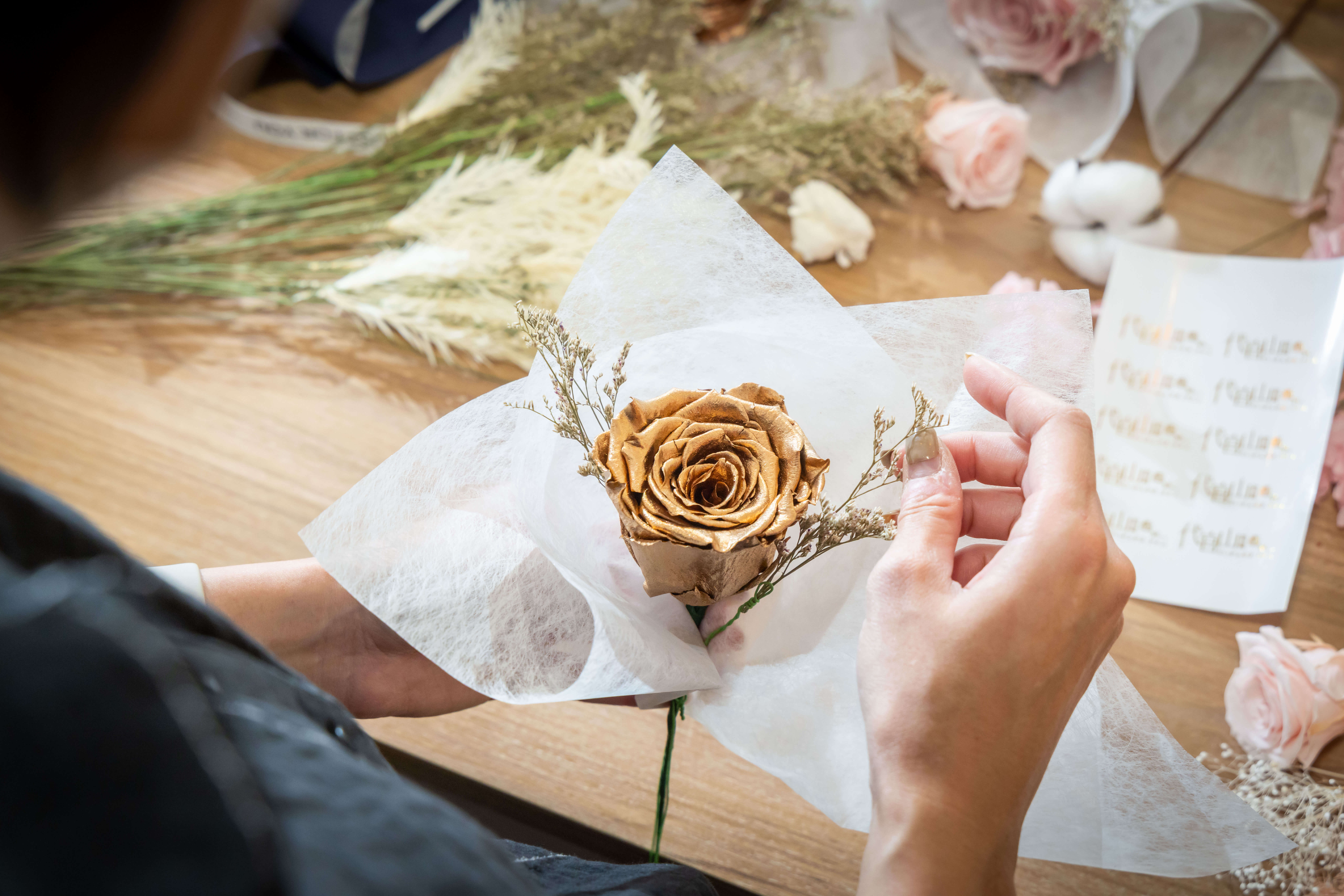 「代官山花苑」將這一美學傳統帶入永生花的領域。永生花是將鮮花在最佳狀態下經過保存處理的產品,與乾燥花不同,永生花保持花材的柔軟與色澤,可以長期陳列。在日本,永生花近年來受到廣泛的關注,這與日本重視精緻工藝、將日常物件視為生活細節的文化傳統並不無關。「代官山花苑」的永生花禮價格自1,680元至9,999元不等,均由花藝師親手製作,每一束都遵循簡約與留白的設計原則。