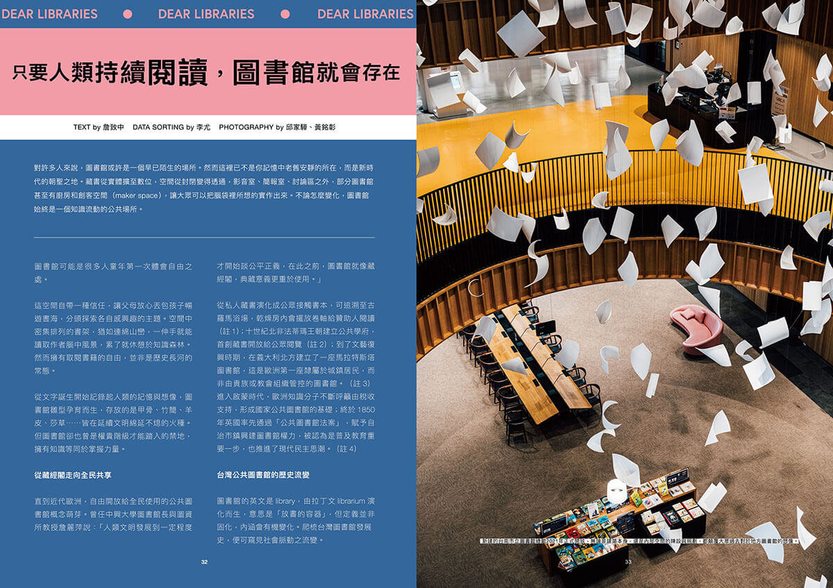 對話這兩年成為空間朝聖之地的屏東縣立圖書館總館與台南市立圖書館總館的建築師張瑪龍與陳玉霖,提問在空間魅力的背後,如何重建閱讀的公共性與閱讀新想像;報導台中海線的大安分館和南投埔里分館,如何透過創意以及挖掘地方意義,吸引民眾走進地方圖書館;