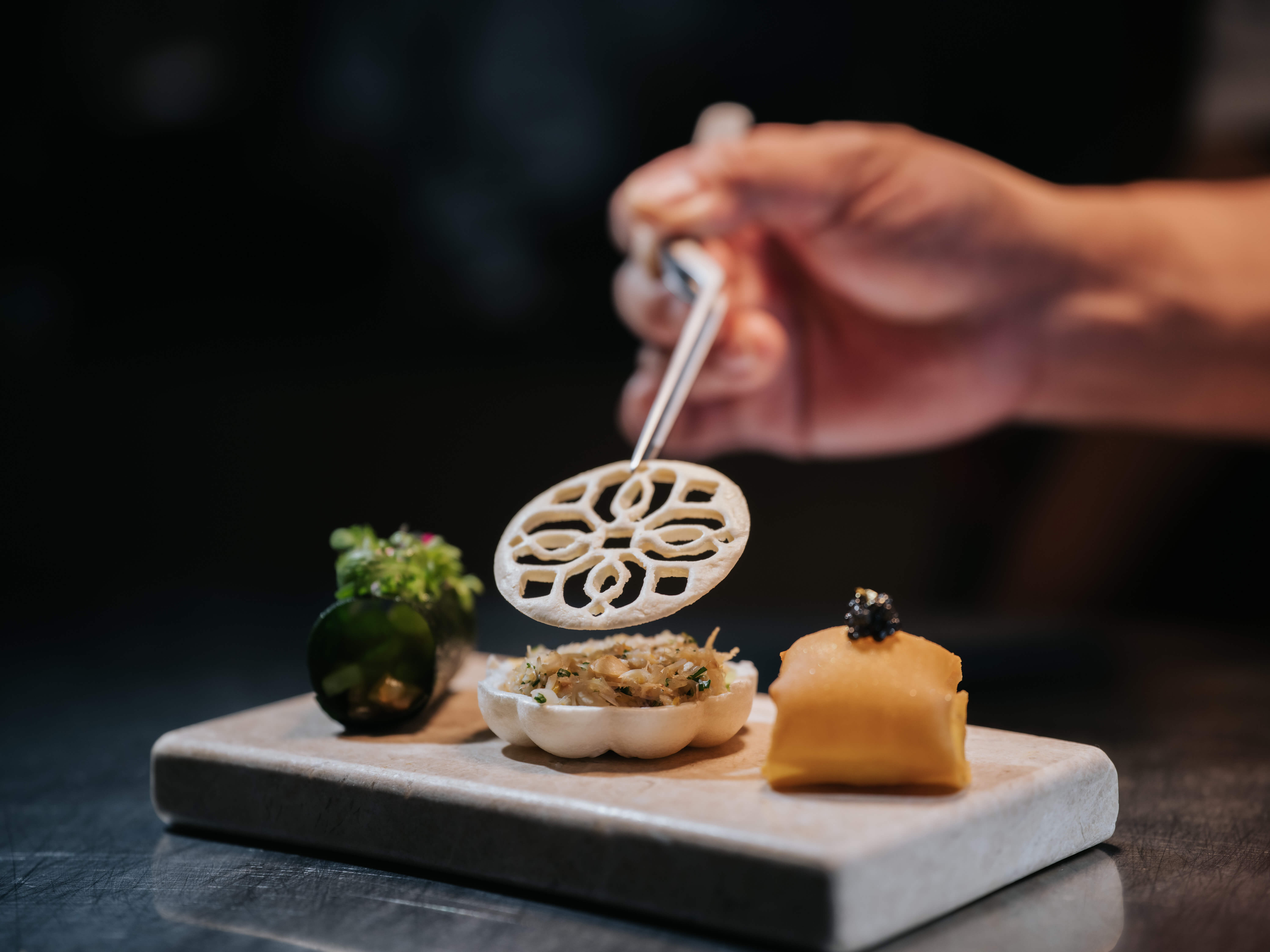 「森林之鳴 Deep Forest Resonance」以 Devialet Phantom Ultimate 全新色 Deep Forest 為靈感,將其「柔霧、內斂卻暗藏能量」的設計語彙延伸出一道融合自然的料理,以風拍葉聲、蟲鳴與山勢的自然迴聲轉化為味覺上的層次堆疊,如同 Phantom 霧面外觀靜謐中湧動張力。