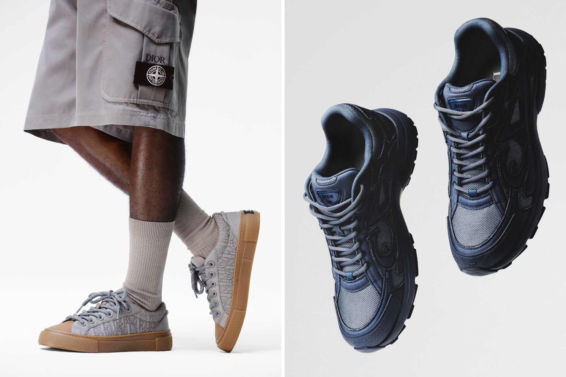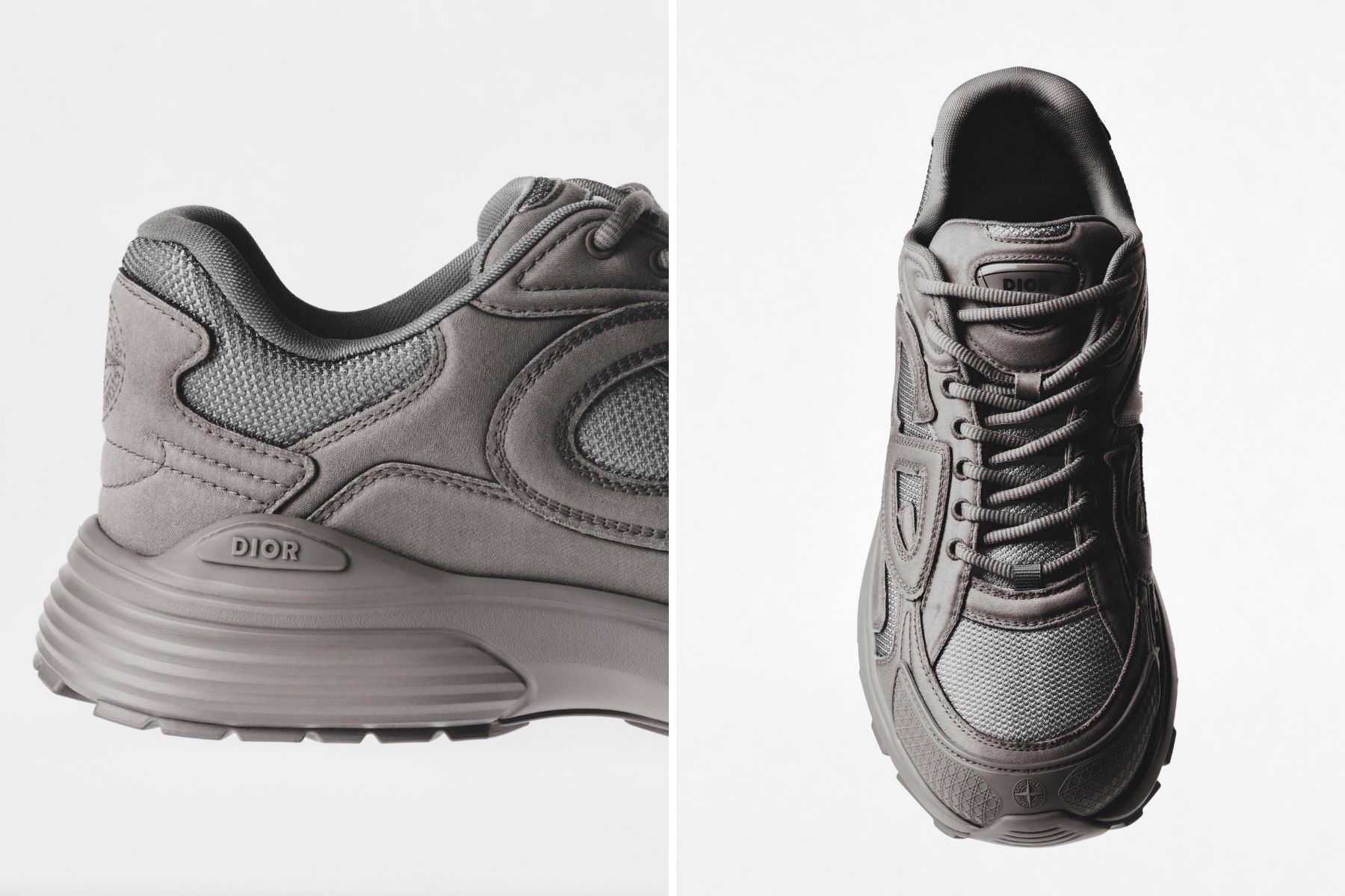 鞋履同樣集兩家之長,在強調功能性之外結合傳統製鞋工藝。靴子和德比鞋向來是Dior男裝經典款,受到野外登山鞋結構的影響,聯名鞋款並透過模板開發的厚底鞋底得到增強;運動鞋則以Stone Island著名面料製成,採用棉緞製鞋,縫有標誌性的Dior Oblique老花。