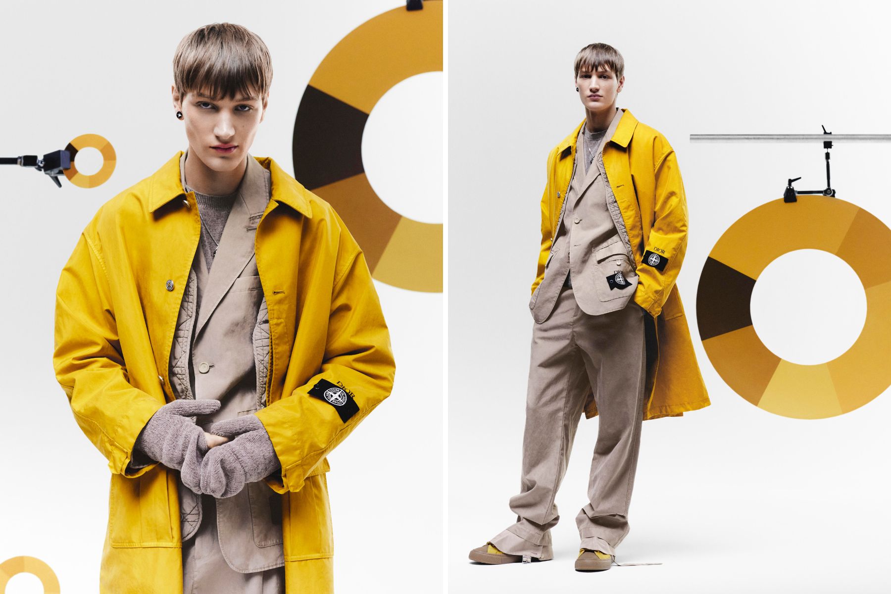 色彩是本系列的中心主題,面料改變了服裝染色工藝的結果,Kim Jones利用Stone Island檔案中的最具代表性的顏色和輪廓,並在強度上進行了轉換,如Raso Gommato 1988-1989年秋冬系列的一款經典 Stone Island野戰夾克,一改初代的棉與橡膠材質,聯名款則以棉絲和壓花皮革呈現。