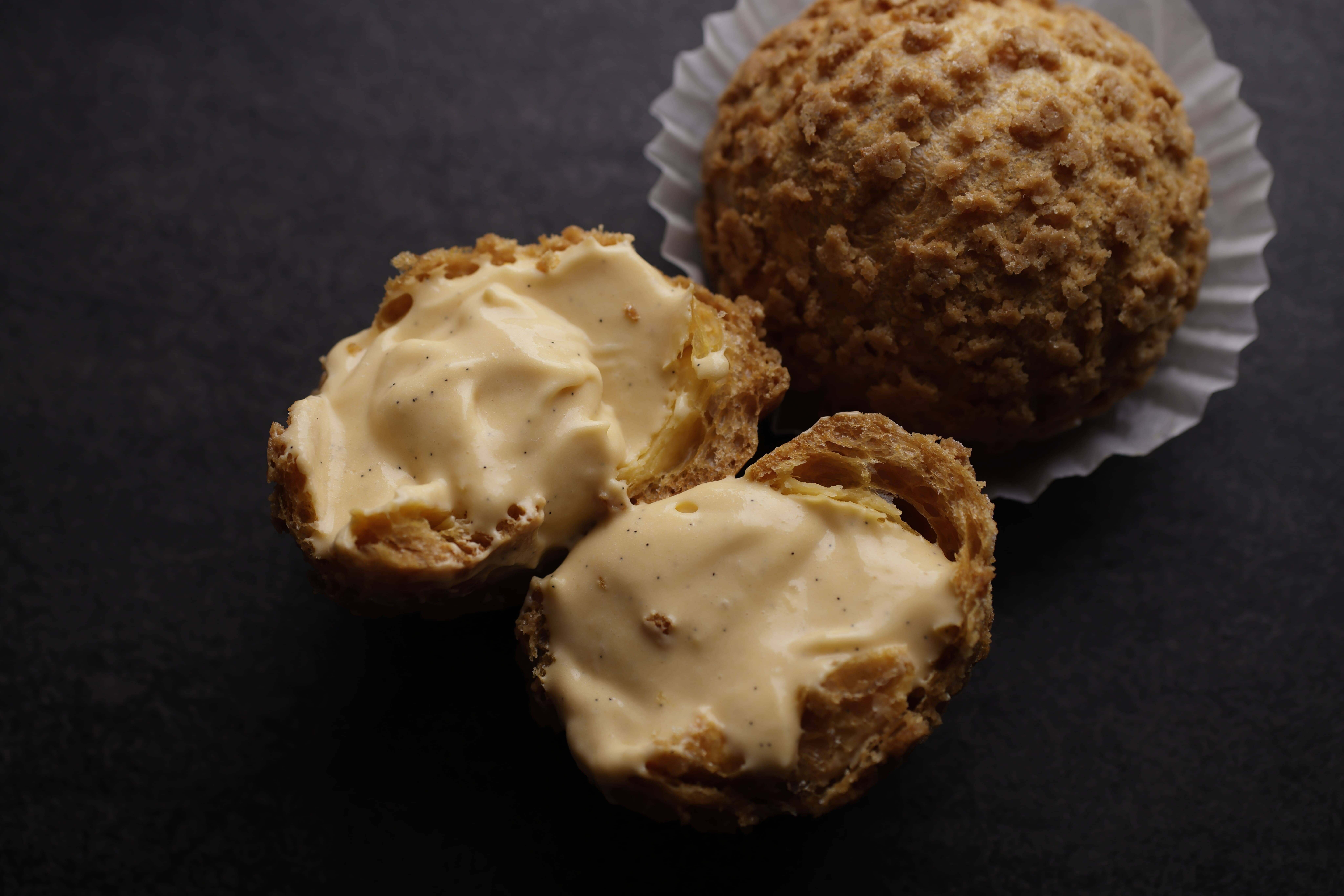 內餡使用比一般泡芙多3倍的馬達加斯加香草籽,每一口都能嚐到香草籽在口中爆開的感覺。外殼烤至餅乾般酥脆,與滑順內餡形成「脆與潤」的對比。