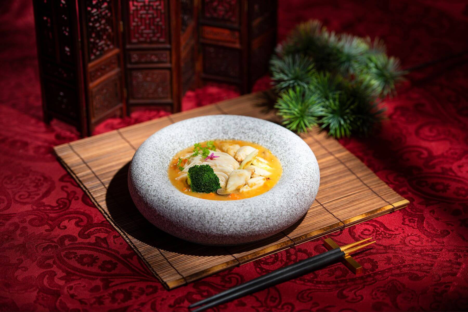 廖晉輝的亮眼創作則有藍鑽蟹肉燴稻庭麵,將熱油煎香薑片和蔥段,放入泰國野生藍鑽蟹肉和蟹膏煎煮,加入濃郁上湯,使其湯汁充滿鮮甜海味,主廚特別選用口感滑順細膩有嚼勁、且有日本貴族血統麵點之稱「手工稻庭麵」,與鮮美蟹肉與湯汁拌勻搭配享用,是道精緻的麵點美饌。