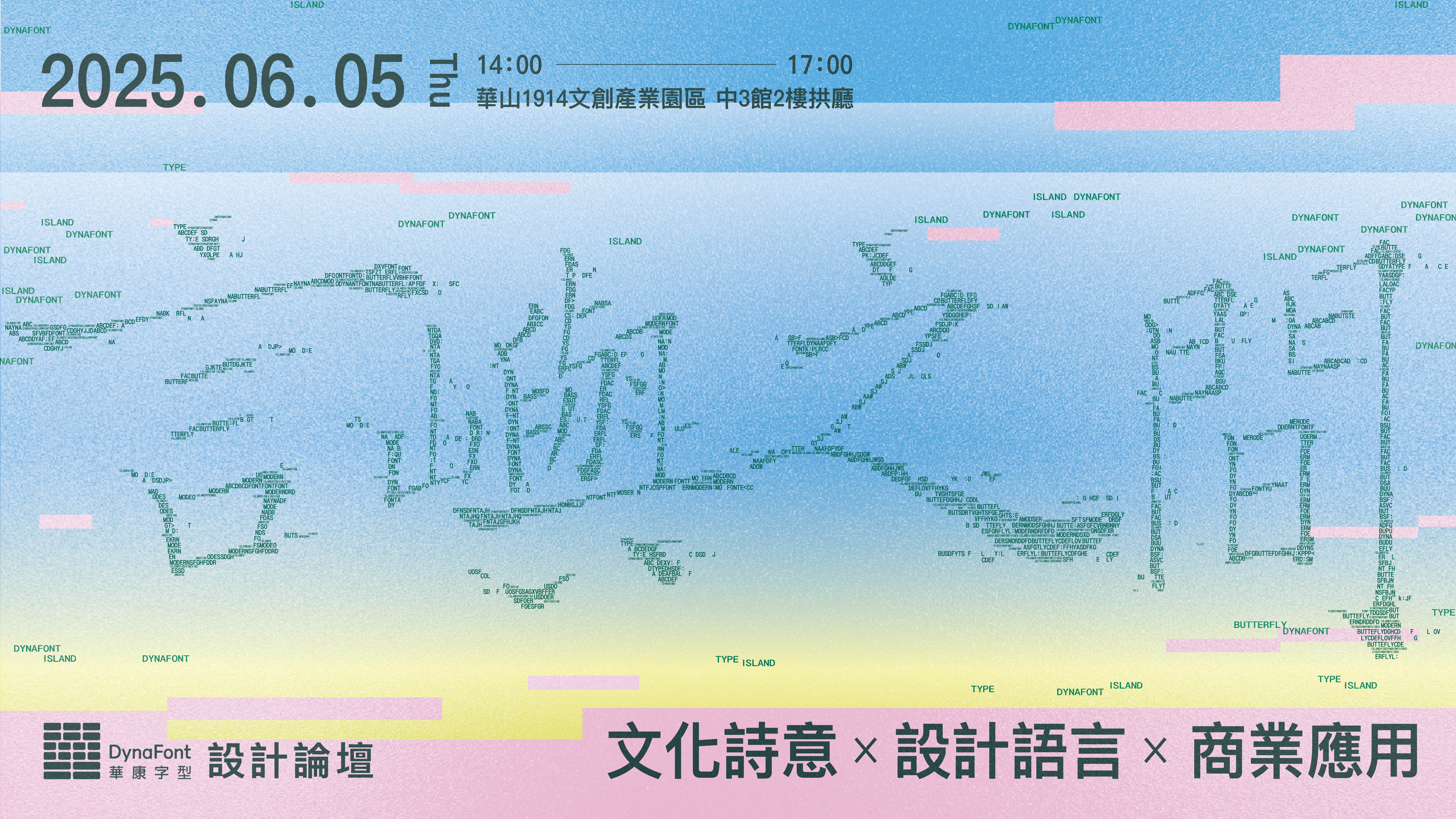以「言嶼之間」為題,從文化的詩意、設計的語言,到品牌與人的距離, 一起討論設計要怎麼說話,才能讓人聽見情感。主視覺以音韻字母組成華康金蝶體的型態,顯現字型在商業應用中逐漸累積、形成印象,也期許讓千百種屬於這座島嶼的語氣被看見。