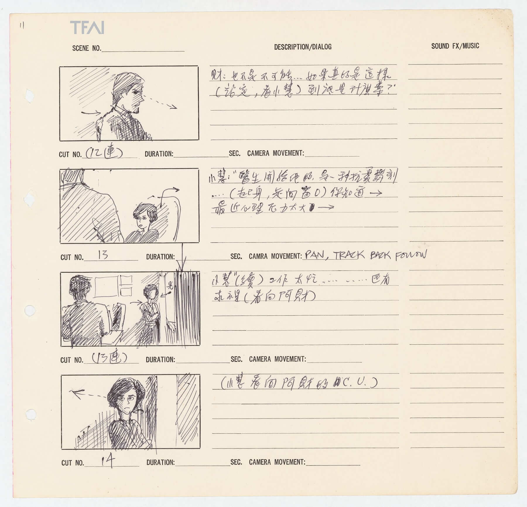 摘自《海灘的一天》分鏡腳本,配角阿財與小慧的對話;除了畫面內容,也註記了楊德昌所想要的運鏡方向、演員視線、光影呈現等。(圖片/國家影視聽中心提供)