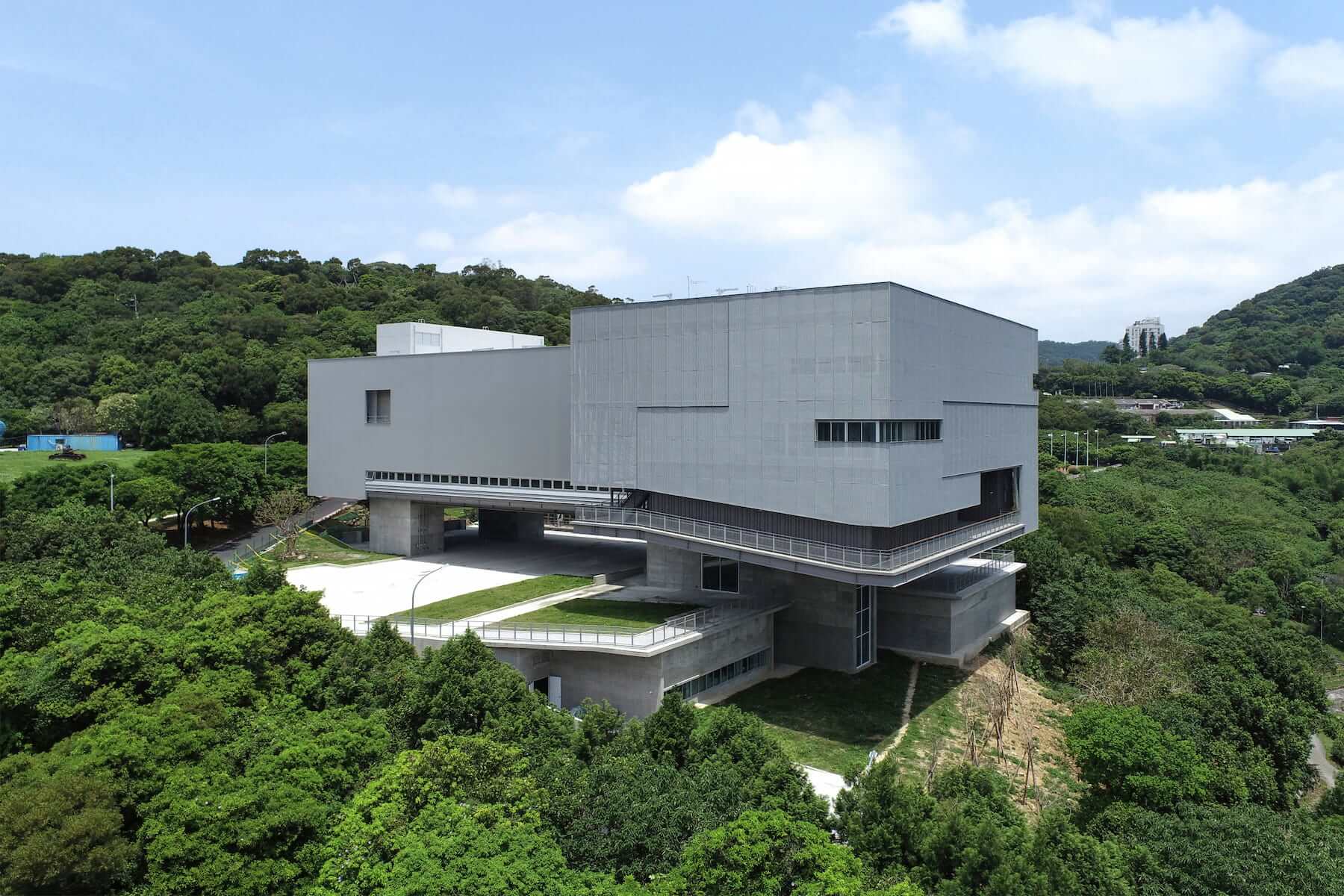 「基地位置在北藝大主要道路的端點也是制高處,可以瞭望校園景觀與關渡平原。」因此郭旭原與黃惠美決定讓建築物「漂浮」起來,像是一個抬升於空中的「方盒子」,盒子下方創造出多功能空間;也像是大雨遮,除了滿足科藝館的入口、車輛迴車的廊道,也可以成為藝術展演、學生活動的場所。