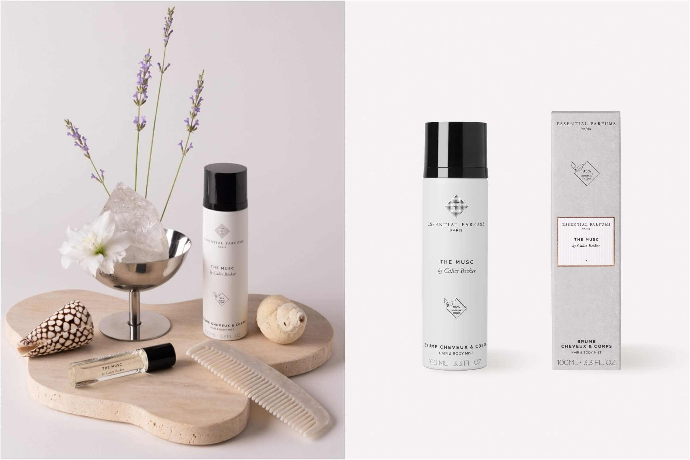 Essential Parfums延續此一核心理念,將三款經典香氣轉化為全新髮香身體噴霧系列,開啟更親近肌膚的香氛保養新篇章。系列運用創新的無酒精配方,以最溫和、不易帶走髮絲水分的方式,在夏季注入輕盈細緻的香氣體驗——噴灑於肌膚,添加的植物性甘油使質地柔嫩保濕且絲毫不黏膩;噴灑於髮絲,則瞬間賦予絲滑光澤與彈性,輕盈而不扁塌。含高達95%以上天然成分的配方,揉合植物性甘油的深層保濕與鎮靜修護,以及椰子油的卓越滋養與鎖水功效,讓保養功效與感官愉悅之間找到最美麗的平衡。