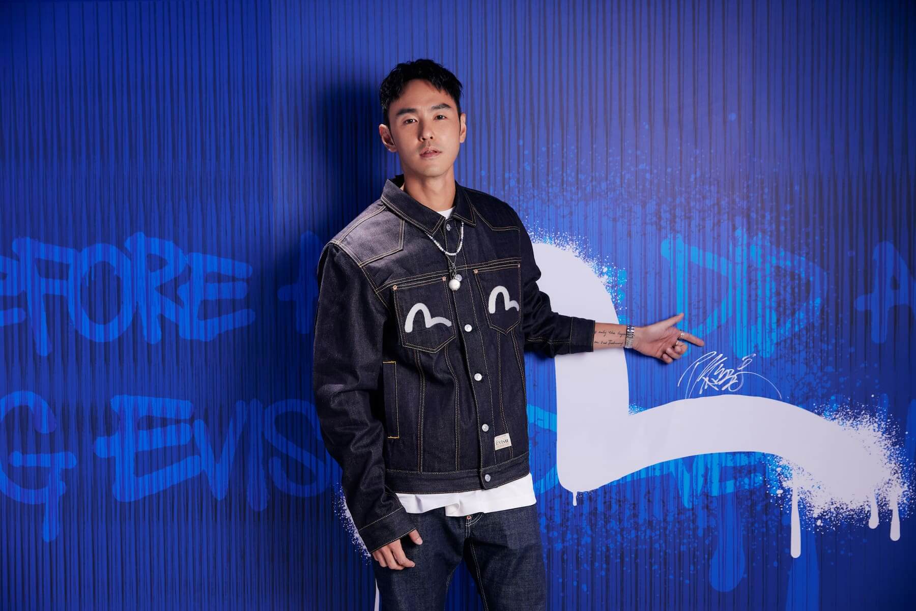 開幕記者會現場小天身著Evergreen AW23系列新款,背後的重點以Osaka和Japan日式雙家花毛絨刺繡牛仔夾克搭配經典刺繡海鷗logo牛仔褲帥氣登場,演繹EVISU獨創潮流的雋永風格。