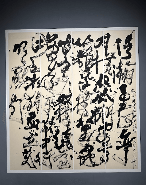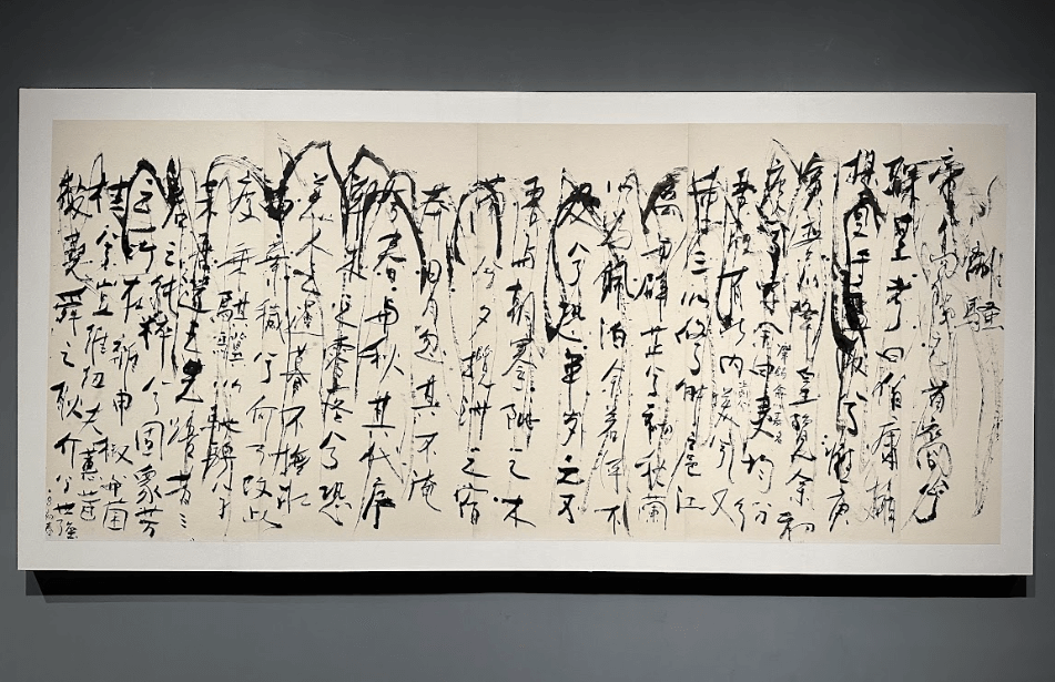 當筆墨不再受制於傳統書體的規範性框架時,書寫便回到東亞哲學語境中的「道」——一個指向開放、流動與生成的場域。第二子題「出離」並非對傳統的反叛,而是一種現象學式的「去形式化」:書寫者暫時放下形式所預設的先驗要求,使身體得以回返至更為原初的感知狀態。於是,字形可以破碎、筆意可以斷裂,美與醜不再構成主要判準,而精神性反而因此更加清晰地浮現於書寫之中。葉世強的〈離騷〉便展現出此一特質,其書寫不再服膺既定法度,而是讓書寫成為身體運動狀態的直接顯現。