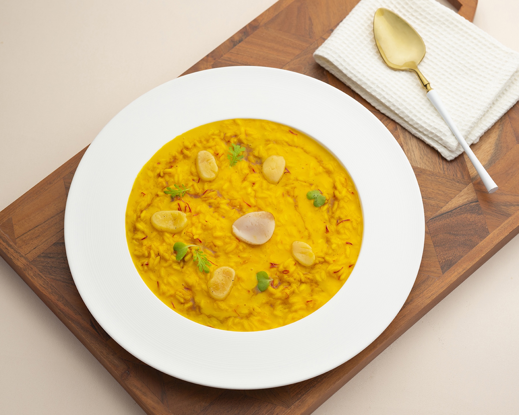 主廚將金黃奪目的番紅花與頂級義大利米慢燉,精準火候保留了米芯彈韌的嚼勁;最關鍵的靈魂在於拌入豐腴滑嫩的牛骨髓,與帕瑪森乾酪、奶油共同乳化後,創造出如同絲絨般滑順且帶有深邃肉脂香氣的濃郁醬汁,讓每一口飽滿的米粒都裹覆著入口即化的甘甜,展現純粹而到位的層次風味。