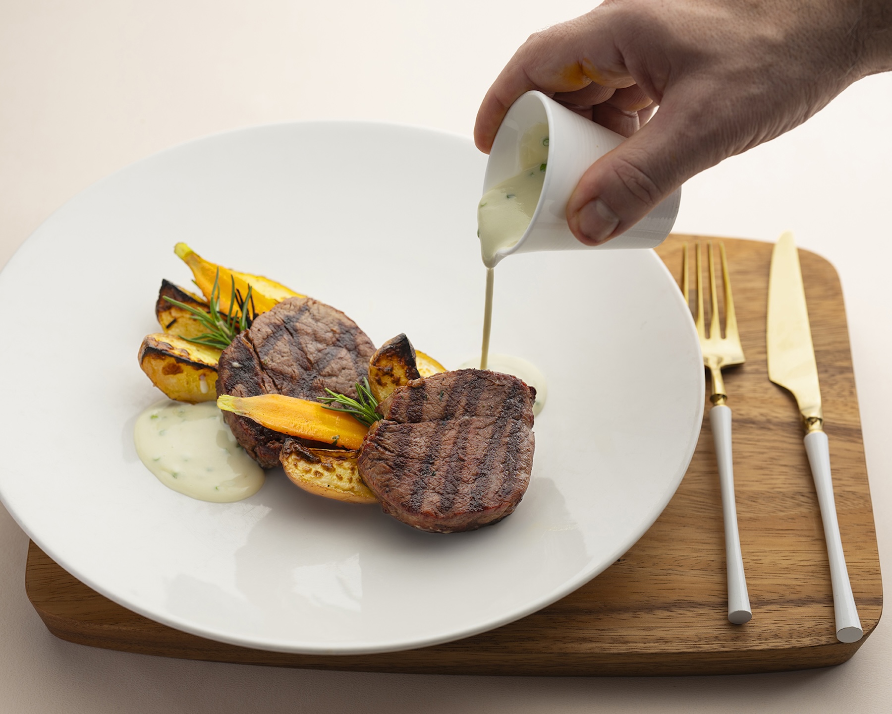 源自18世紀主廚家鄉皮埃蒙特的經典。嚴選油脂輕盈的頂級菲力,高溫炭烤封存飽滿肉汁,外層焦香而內裡如絲緞柔軟;搭配濃郁藍紋起司醬,提升味覺的立體深度。