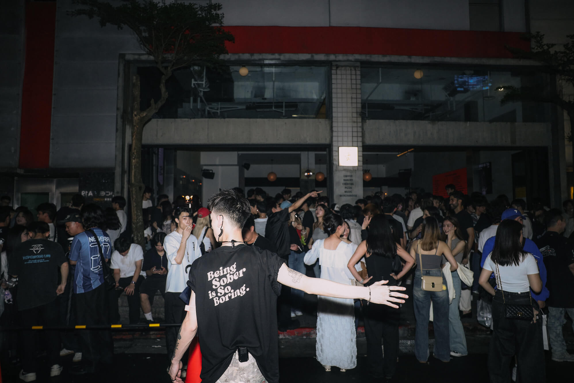 不用到周末,信義威秀戲院旁、松壽路20巷的Fake Sober已是Z世代不分時間的朝聖點,沒有落地窗、門扇的界線隔閡,蝴蝶門推開,入夜後的狂歡熱鬧把人們溢出街道,手上拿著調酒的,清一色是20代年輕人,就連對面的全家便利商店也如夜店般滿滿人潮。
