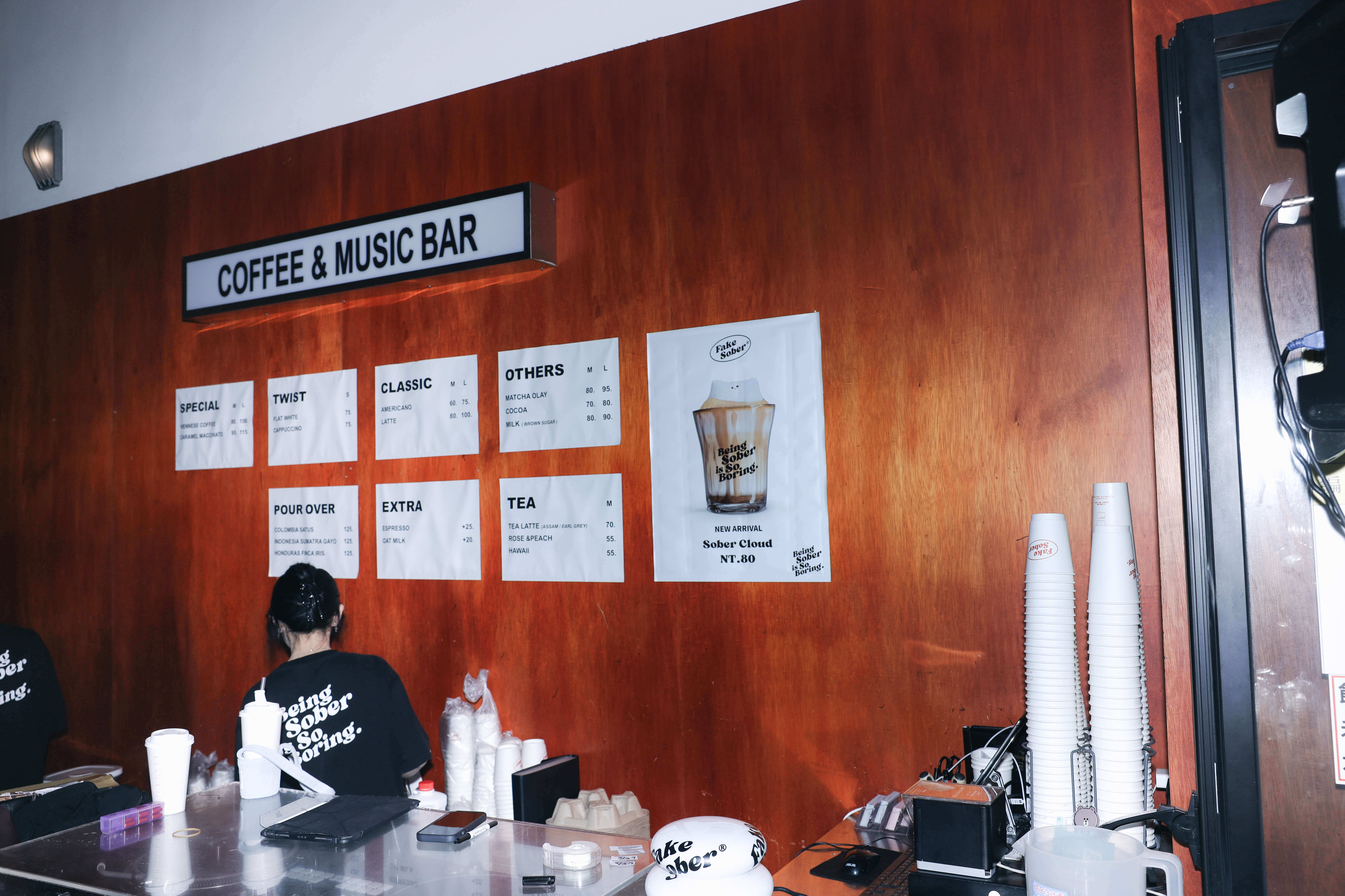 而且,他們傍晚6點前只賣咖啡,6點後只賣調酒,即便總有人央求要在時間裡喝到規定外的飲品,羅伊都堅持這規則不能打破,他很清楚不該賺的錢不要賺;意思是喝咖啡、喝酒的客群不同,要讓兩邊的人都達到共鳴與認同,勢必要切割場域氛圍。好比說晚上的DJ台在白天不能過度明顯,為了淡化夜場氣息,他拿罩子蓋住混音器設備,在上方堆疊起咖啡杯,甚至在Fake Sober旁邊又開了一間Sober Bakery,賣起了可頌、麵包。