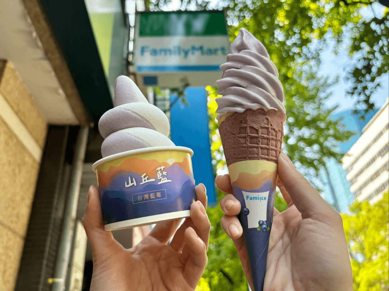 「全家」為獨家實體販售「山丘藍 台灣藍莓」的便利商店,並在今年四月開賣山丘藍霜淇淋。