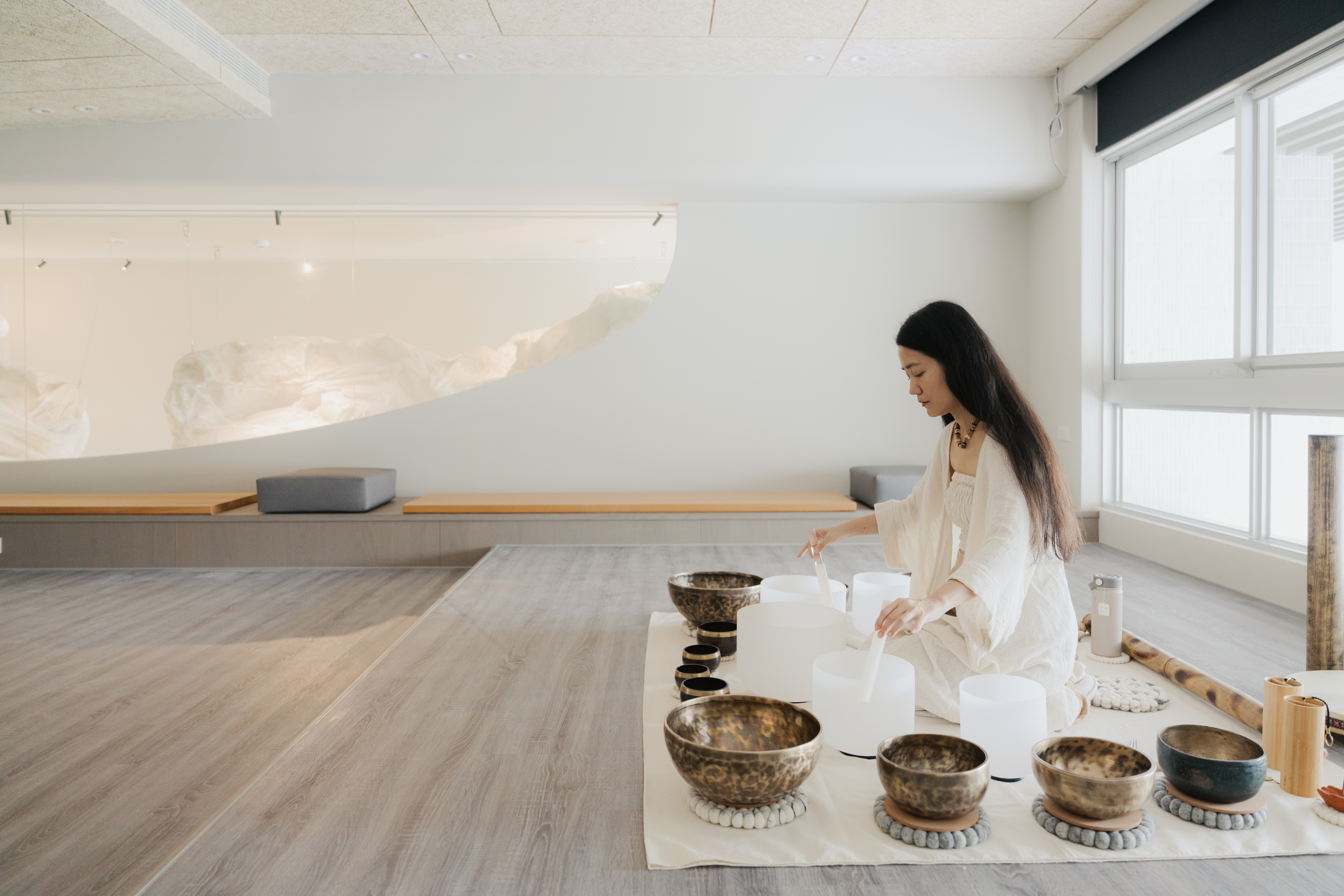 呼應自然觀察循序漸進的視覺感知及體感走入茶道閤樓,沈浸在頌缽的聲響,閤樓是賞石的制高點,能細觀〈 叄石 〉的近觀紋理,閱讀著山石的稜線或是雲水的流動。這裡安坐著頌缽音療師愛希Ashley,她專注敲擊著水晶缽,透過音頻,引導來賓靜心感受,一聲聲地,傳遞自然的無私包容與療癒。
