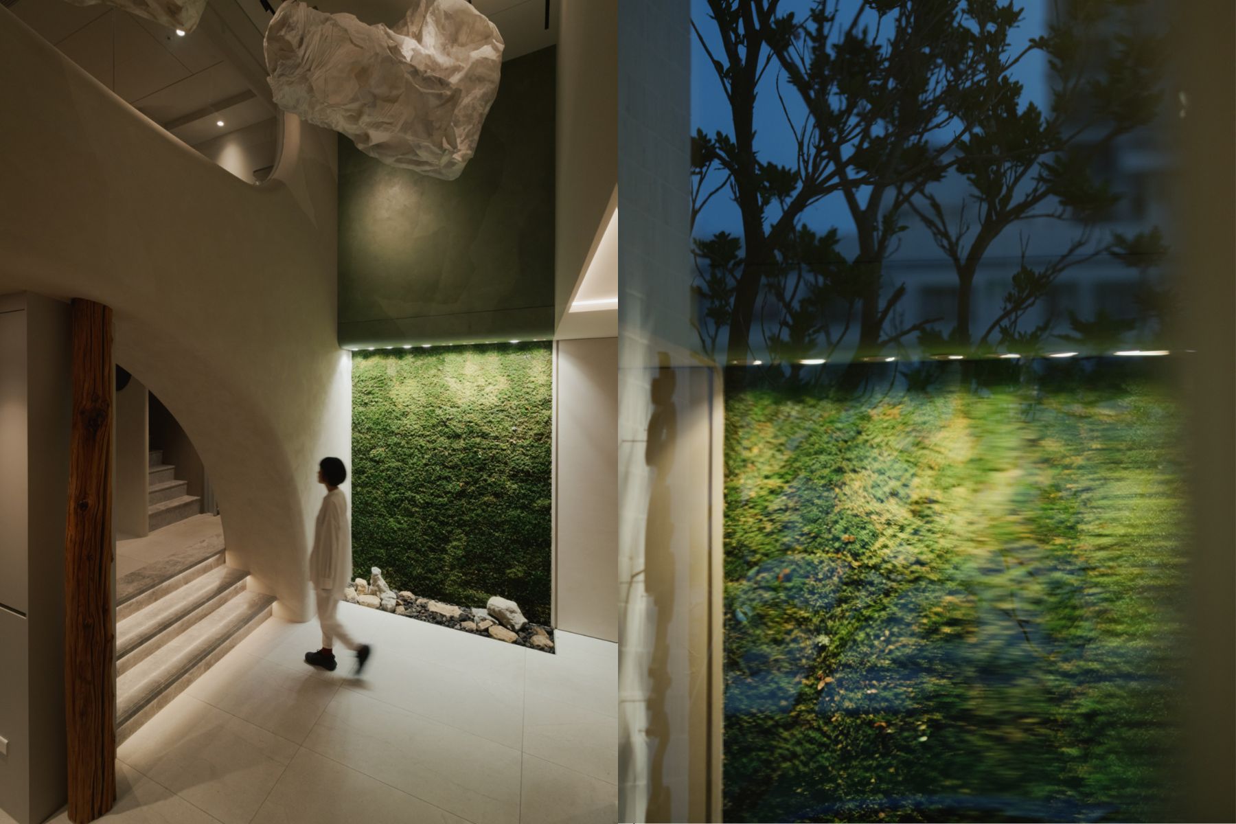 FENKO鳳嬌催化室為尚暘天閤的開幕,延伸策展計畫,揭幕北美館〈 Heterogeneous 崎:叁石 〉的全新落成,為原本僅 289 坪的基地空間,透過紙石雲山的自然意象,放大視覺格局,調度場景,讓回家,成為與自然連結的開始。一片歡綠的活苔蘚森林,融合了山、水、畫的元素,縮影呈現台灣山林之美,是回家的第一個禮物,也讓擁抱綠意、淨化身心,成為家的日常儀式,共振自然的美好與寧靜。