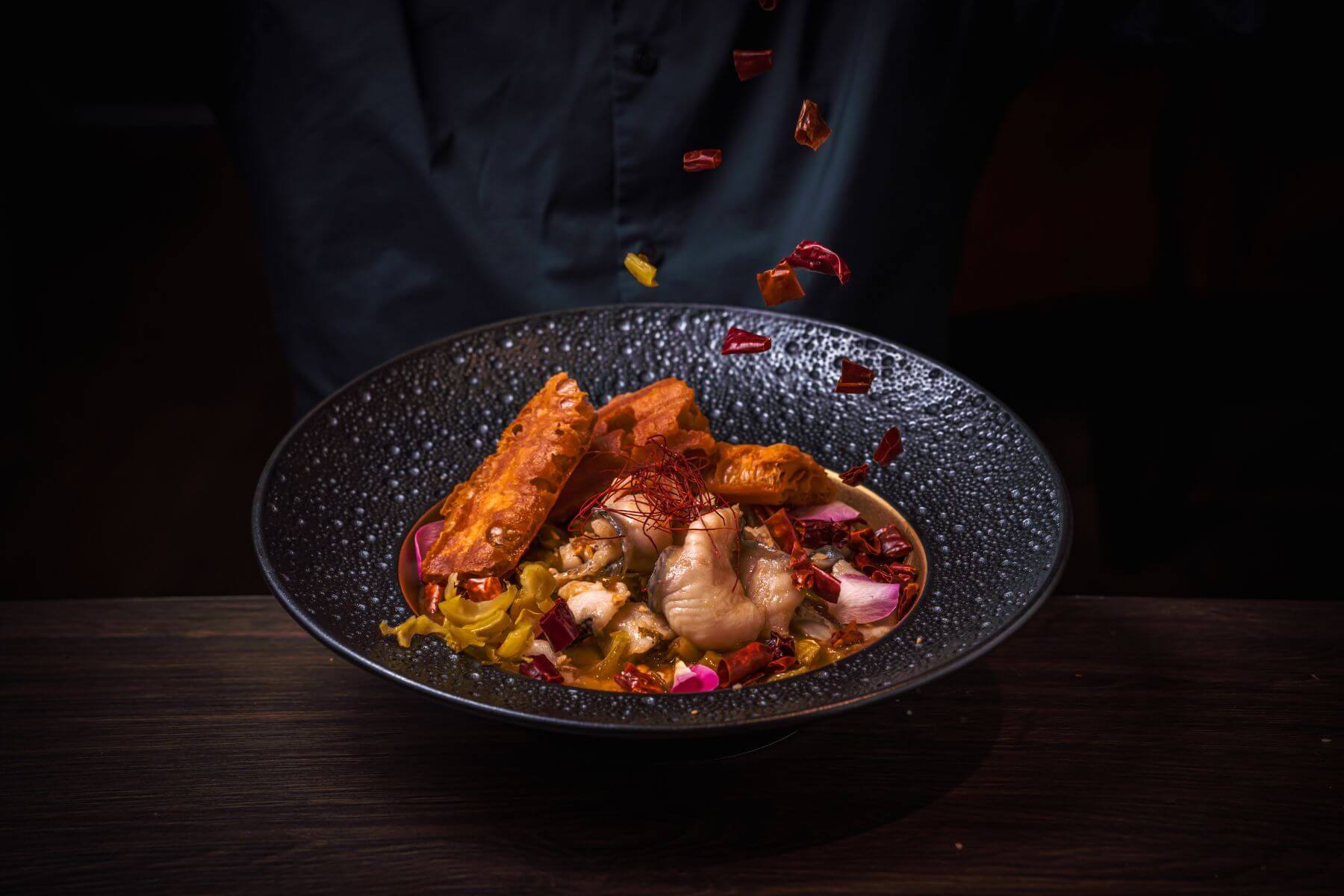 老罈酸菜魚:選用四川傳統老罈酸菜,酸香濃郁,搭配臺灣在地豆花,口感豐富。再加入空運來臺的黑鯉魚片,肉質細嫩,與酸菜湯汁完美融合,辣而不燥,回味無窮。