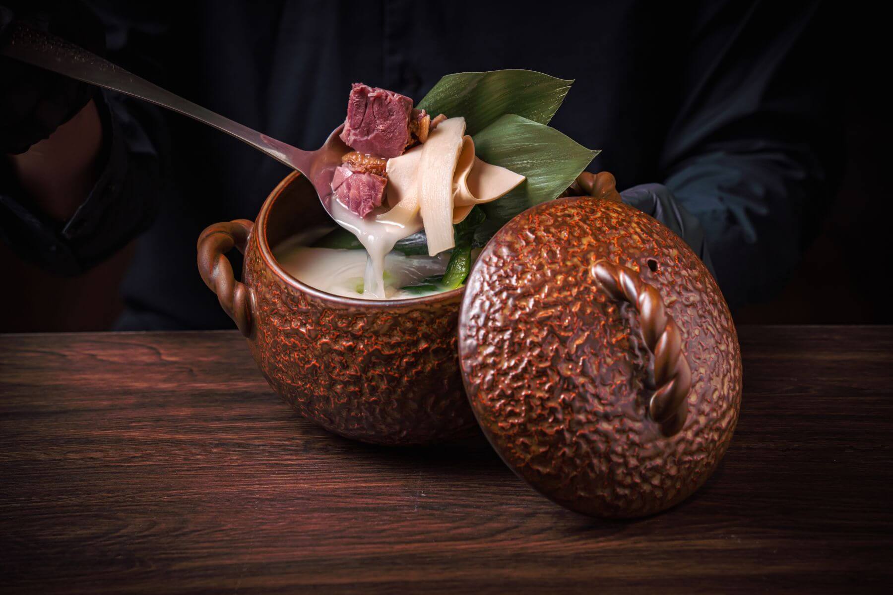螢火部落的菜色選擇豐富多樣,除了招牌的鑄火料理外,更精心研發多款特色菜,滿足不同客人的味蕾。其中最令人驚豔的莫過於有著湯中之王稱號的江南經典湯品──「醃篤鮮」,以長時間慢火燉煮,湯頭色澤呈現濃郁乳白,加入鹹豬肉、鮮肉、冬筍、百葉結等經典元素,與湯頭完美融合,風味層次豐富又鮮美。